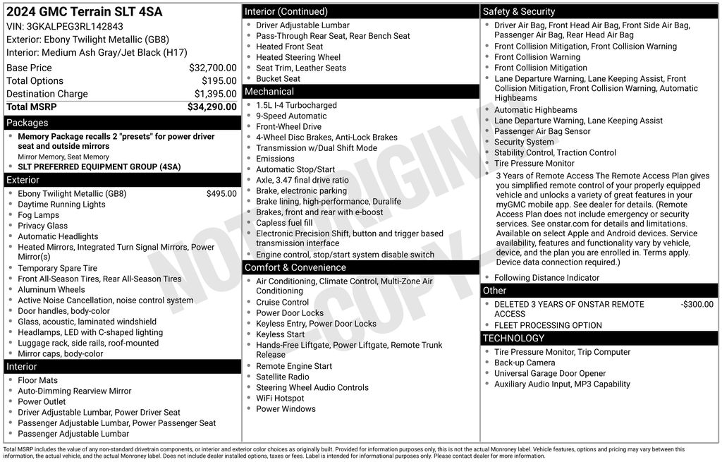 2024 GMC Terrain SLT Ebony Twilight Metallic SLT FWD 9-Speed Automatic 1.5L DOHC 2 USB Data Ports, 2 USB Data Ports w/SD Card Reader, 3.47 Final Drive Axle Ratio, 4-Wheel Disc Brakes, 6 Speakers, 6-Speaker Audio System Feature, 6-Way Power Front Passenger Seat, 8-Way Power Driver Seat Adjuster, ABS brakes, Air Conditioning, Alloy wheels, AM/FM radio: SiriusXM, Auto High-beam Headlights, Auto-dimming Rear-View mirror, Automatic temperature control, Bluetooth® For Phone, Brake assist, Bumpers: body-color, Compass, Delay-off headlights, Deleted 3 Years of Remote Access, Driver & Front Passenger Heated Seats, Driver door bin, Driver vanity mirror, Dual front impact airbags, Dual front side impact airbags, Electronic Stability Control, Emergency communication system: OnStar and GMC connected services capable, Four wheel independent suspension, Front anti-roll bar, Front Bucket Seats, Front Center Armrest, Front dual zone A/C, Front fog lights, Front Passenger 2-Way Power Lumbar, Front reading lights, Fully automatic headlights, Garage door transmitter, Heated door mirrors, Heated front seats, Heated steering wheel, Illuminated entry, Low tire pressure warning, Memory seat, Occupant sensing airbag, Outside temperature display, Overhead airbag, Overhead console, Panic alarm, Passenger door bin, Passenger vanity mirror, Perforated Leather-Appointed Seat Trim, Power door mirrors, Power Driver Lumbar Control, Power driver seat, Power Liftgate, Power passenger seat, Power steering, Power windows, Preferred Equipment Group 4SA, Radio data system, Radio: GMC Infotainment Audio System w/8" Display, Rear anti-roll bar, Rear seat center armrest, Rear window defroster, Rear window wiper, Remote keyless entry, Roof rack: rails only, Security system, SiriusXM, Speed control, Speed-sensing steering, Split folding rear seat, Spoiler, Steering wheel mounted audio controls, Tachometer, Telescoping steering wheel, Tilt steering wheel, Traction control, Trip computer, Turn signal indicator mirrors, Variably intermittent wipers, Wheels: 18" x 7" Silver Painted Aluminum, Wireless Apple CarPlay/Wireless Android Auto.