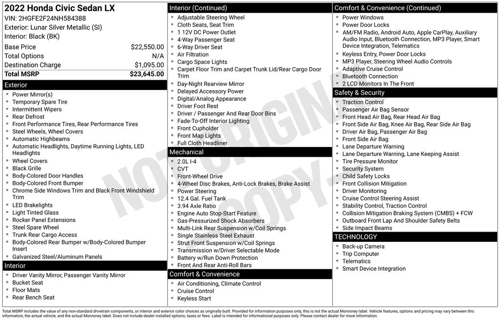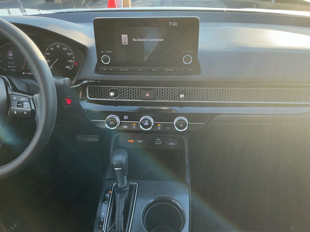 2022 Honda Civic LX Silver LX FWD CVT 2.0L I4 DOHC 16V i-VTEC Cloth, 16" Wheels w/Full Covers, 4 Speakers, 4-Wheel Disc Brakes, ABS brakes, Adaptive Cruise Control: Adaptive Cruise Control (ACC) with Low-Speed Follow, Air Conditioning, AM/FM radio, Apple CarPlay/Android Auto, Auto High-beam Headlights, Automatic temperature control, Brake assist, Bumpers: body-color, Cloth Seat Trim, Delay-off headlights, Driver door bin, Driver vanity mirror, Dual front impact airbags, Dual front side impact airbags, Electronic Stability Control, Emergency communication system: HondaLink, Exterior Parking Camera Rear, Forward collision: Collision Mitigation Braking System (CMBS) + FCW mitigation, Four wheel independent suspension, Front anti-roll bar, Front Bucket Seats, Front Center Armrest, Front reading lights, Fully automatic headlights, Illuminated entry, Knee airbag, Low tire pressure warning, Occupant sensing airbag, Outside temperature display, Overhead airbag, Panic alarm, Passenger door bin, Passenger vanity mirror, Power door mirrors, Power steering, Power windows, Radio data system, Radio: 160-Watt AM/FM Audio System, Rear anti-roll bar, Rear side impact airbag, Rear window defroster, Remote keyless entry, Security system, Speed control, Speed-sensing steering, Steering wheel mounted audio controls, Tachometer, Telescoping steering wheel, Tilt steering wheel, Traction control, Trip computer, Cloth.