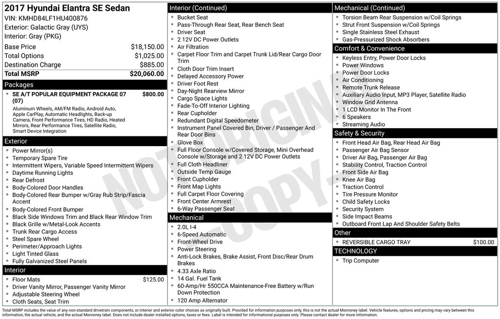 2017 Hyundai Elantra SE Galactic Gray SE FWD 6-Speed Automatic 2.0L 4-Cylinder DOHC 16V 15" Steel Wheels w/Covers, 16" Alloy Wheels, 6 Speakers, ABS brakes, Air Conditioning, AM/FM radio: SiriusXM, Brake assist, Bumpers: body-color, Carpeted Floor Mats, CD player, Delay-off headlights, Driver door bin, Driver vanity mirror, Dual front impact airbags, Dual front side impact airbags, Electronic Stability Control, Front anti-roll bar, Front Bucket Seats, Front Center Armrest, Front reading lights, Front wheel independent suspension, Illuminated entry, Knee airbag, Low tire pressure warning, Occupant sensing airbag, Outside temperature display, Overhead airbag, Overhead console, Panic alarm, Passenger door bin, Passenger vanity mirror, Power door mirrors, Power steering, Power windows, Premium Cloth Seat Trim, Radio: AM/FM/HD/SiriusXM Display Audio, Radio: AM/FM/SiriusXM/CD/MP3 Audio System, Rear window defroster, Remote keyless entry, Reversible Cargo Tray, SE A/T Popular Equipment Package 07, Security system, Speed control, Speed-sensing steering, Split folding rear seat, Steering wheel mounted audio controls, Tachometer, Telescoping steering wheel, Tilt steering wheel, Traction control, Trip computer, Variably intermittent wipers.