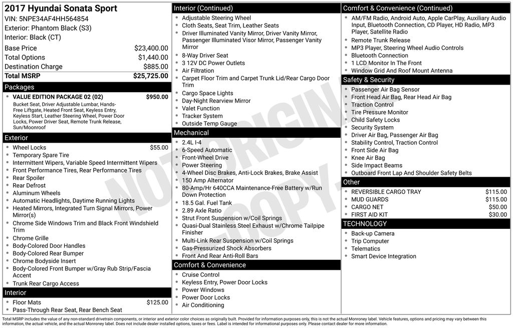 2017 Hyundai Sonata Sport Phantom Black Sport FWD 6-Speed Automatic with Shiftronic 2.4L I4 DGI DOHC 16V ULEV II 185hp Black Leather, 4-Wheel Disc Brakes, 6 Speakers, ABS brakes, Air Conditioning, Alloy wheels, AM/FM radio: SiriusXM, Apple CarPlay & Android Auto, Brake assist, Bumpers: body-color, Cargo Net, Carpeted Floor Mats, CD player, Delay-off headlights, Driver door bin, Driver vanity mirror, Dual front impact airbags, Dual front side impact airbags, Electronic Stability Control, Emergency communication system: Blue Link, Exterior Parking Camera Rear, First Aid Kit, Four wheel independent suspension, Front anti-roll bar, Front Bucket Seats, Front Center Armrest, Front reading lights, Fully automatic headlights, Heated door mirrors, Illuminated entry, Knee airbag, Low tire pressure warning, Mud Guards, Occupant sensing airbag, Outside temperature display, Overhead airbag, Overhead console, Panic alarm, Passenger door bin, Passenger vanity mirror, Power door mirrors, Power driver seat, Power steering, Power windows, Radio: AM/FM/SiriusXM/CD/MP3 Display Audio, Rear anti-roll bar, Rear seat center armrest, Rear window defroster, Remote keyless entry, Reversible Cargo Tray, Security system, Speed control, Speed-sensing steering, Speed-Sensitive Wipers, Split folding rear seat, Spoiler, Steering wheel mounted audio controls, Tachometer, Telescoping steering wheel, Tilt steering wheel, Traction control, Trip computer, Turn signal indicator mirrors, Value Edition Package 02, Variably intermittent wipers, Wheel Locks, Wheels: 17 x 7.0J Aluminum Alloy, YES Essentials Premium Cloth Seating Surfaces, Black Leather.