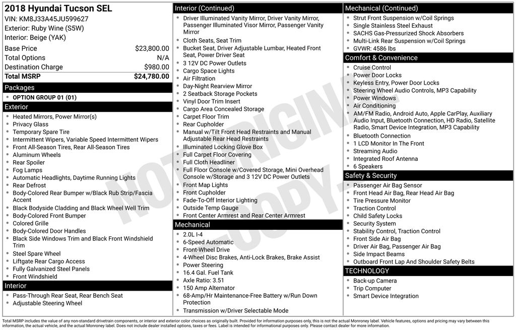 2018 Hyundai Tucson SEL Ruby Wine SEL FWD 6-Speed Automatic with Shiftronic 2.0L DOHC 17" x 7.0J Alloy Wheels, 4-Wheel Disc Brakes, 6 Speakers, ABS brakes, Air Conditioning, Alloy wheels, AM/FM radio: SiriusXM, Apple CarPlay & Android Auto, Axle Ratio: 3.51, Brake assist, Bumpers: body-color, Delay-off headlights, Driver door bin, Driver vanity mirror, Dual front impact airbags, Dual front side impact airbags, Electronic Stability Control, Exterior Parking Camera Rear, Four wheel independent suspension, Front anti-roll bar, Front Bucket Seats, Front Center Armrest, Front fog lights, Front reading lights, Fully automatic headlights, Heated door mirrors, Heated Front Bucket Seats, Heated front seats, Illuminated entry, Low tire pressure warning, Occupant sensing airbag, Option Group 01, Outside temperature display, Overhead airbag, Overhead console, Panic alarm, Passenger door bin, Passenger vanity mirror, Power door mirrors, Power driver seat, Power steering, Power windows, Radio: AM/FM/HD Radio/MP3 Audio System, Rear anti-roll bar, Rear seat center armrest, Rear window defroster, Rear window wiper, Remote keyless entry, Roof rack: rails only, Security system, Speed control, Speed-sensing steering, Split folding rear seat, Spoiler, Steering wheel mounted audio controls, Tachometer, Telescoping steering wheel, Tilt steering wheel, Traction control, Trip computer, Variably intermittent wipers, YES Essentials Cloth Seat Trim.