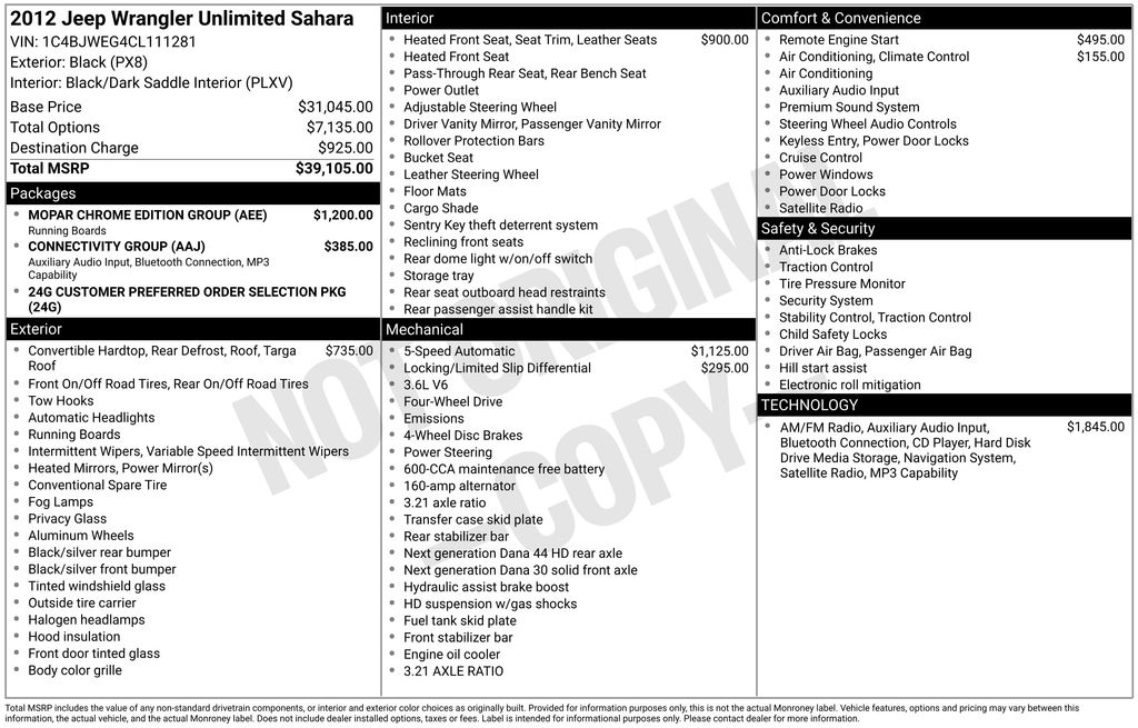 2012 Jeep Wrangler Unlimited Sahara Black Clearcoat Unlimited Sahara 4WD 5-Speed Automatic 3.6L V6 24V VVT 1-Year Sirius Travel Link Service, 18" x 7.5" Painted Aluminum Wheels, 3.21 Rear Axle Ratio, 4-Wheel Disc Brakes, 40GB Hard Drive w/20GB Available, 7 Speakers, ABS brakes, Air Conditioning, Air Conditioning w/Auto Temperature Control, Air Filtering, Alloy wheels, AM/FM radio: SIRIUS, Anti-Spin Differential Rear Axle, Audio Jack Input for Mobile Devices, Black 3-Piece Hard Top, Brake assist, CD player, Cloth Bucket Seats, Compass, Connectivity Group, Driver door bin, Driver vanity mirror, Dual front impact airbags, Electronic Stability Control, Freedom Panel Storage Bag, Front anti-roll bar, Front Bucket Seats, Front Center Armrest w/Storage, Front fog lights, Fully automatic headlights, Heated door mirrors, Heated Front Seats, Heavy Duty Suspension w/Gas Shocks, Illuminated entry, Integrated roll-over protection, Leather steering wheel, Low tire pressure warning, Mopar Chrome Edition Group, Mopar Chrome Exhaust Tip, Mopar Chrome Fuel Filler Door, MOPAR Chrome Taillamp Guards, Mopar Chrome Tubular Side Steps, Occupant sensing airbag, Outside temperature display, Panic alarm, Passenger door bin, Passenger vanity mirror, Power door mirrors, Power steering, Power windows, Quick Order Package 24G, Radio data system, Radio: Uconnect 130 CD/MP3, Radio: Uconnect 730N CD/DVD/MP3/HDD/NAV, Rear anti-roll bar, Rear Window Defroster, Rear Window Wiper/Washer, Remote keyless entry, Remote Start System, Remote USB Port, Security system, SIRIUS Realtime Traffic, SIRIUSXM Traffic, SiriusXM Travel Link, Speed control, Split folding rear seat, Steering wheel mounted audio controls, Tachometer, Tilt steering wheel, Traction control, Trip computer, Uconnect Voice Command w/Bluetooth, Variably intermittent wipers, Vehicle Information Center.