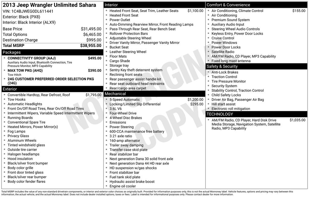 2013 Jeep Wrangler Unlimited Sahara Black Clearcoat Unlimited Sahara 4WD 5-Speed Automatic 3.6L V6 24V VVT 1-Year SIRIUSXM Travel Link Service, 18" x 7.5" Polished Satin Carbon Wheels, 4-Wheel Disc Brakes, 40GB Hard Drive w/28GB Available, 6.5" Touch Screen Display, 7 Speakers, ABS brakes, Air Conditioning, Air Conditioning w/Auto Temperature Control, Air Filtering, Alloy wheels, AM/FM radio: SIRIUS, Anti-Spin Differential Rear Axle, Audio Jack Input for Mobile Devices, Auto-dimming Rear-View mirror, Brake assist, CD player, Class II Receiver Hitch, Cloth Bucket Seats, Compass, Connectivity Group, Driver door bin, Driver vanity mirror, Dual front impact airbags, Electronic Stability Control, Freedom Panel Storage Bag, Front anti-roll bar, Front Bucket Seats, Front Center Armrest w/Storage, Front fog lights, Front reading lights, Fully automatic headlights, GPS Navigation, Heated door mirrors, Heated Front Seats, Heavy Duty Suspension w/Gas Shocks, Illuminated entry, Integrated roll-over protection, Leather steering wheel, Low tire pressure warning, Max Tow Package, Occupant sensing airbag, Outside temperature display, Panic alarm, Passenger door bin, Passenger vanity mirror, Power door mirrors, Power steering, Power windows, Quick Order Package 24G, Radio data system, Radio: Uconnect 130 AM/FM/CD/MP3, Radio: Uconnect 430N CD/DVD/MP3/HDD/NAV, Rear anti-roll bar, Rear Window Defroster, Rear Window Wiper/Washer, Remote keyless entry, Remote USB Port, Security system, SiriusXM Travel Link, Speed control, Split folding rear seat, Steering wheel mounted audio controls, Tachometer, Tilt steering wheel, Tire Pressure Monitoring Display, Traction control, Trailer Tow w/4-Pin Connector Wiring, Trip computer, Variably intermittent wipers, Vehicle Information Center.