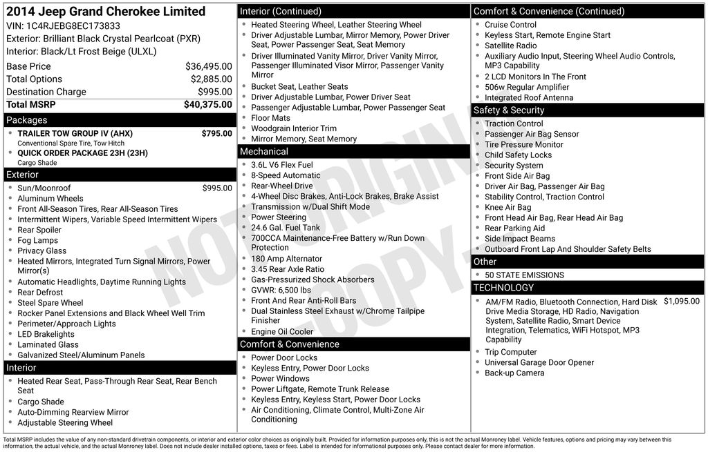 2014 Jeep Grand Cherokee Limited Brilliant Black Crystal Pearlcoat Limited RWD 8-Speed Automatic 3.6L V6 Flex Fuel 24V VVT 10 Speakers, 18" x 8.0" Aluminum Polished Wheels, 3.45 Rear Axle Ratio, 4-Wheel Disc Brakes, 7 & 4 Pin Wiring Harness, 8.4" Touchscreen Display, 9 Amplified Speakers w/Subwoofer, ABS brakes, Air Conditioning, Alloy wheels, AM/FM radio: SiriusXM, Anti-whiplash front head restraints, Audio memory, Auto-dimming door mirrors, Auto-dimming Rear-View mirror, Automatic temperature control, Brake assist, Bumpers: body-color, Cargo Compartment Cover, Class IV Receiver Hitch, Compass, Delay-off headlights, Driver door bin, Driver vanity mirror, Dual front impact airbags, Dual front side impact airbags, Eco Suspension I, Electronic Stability Control, Exterior Parking Camera Rear, Four wheel independent suspension, Front anti-roll bar, Front Bucket Seats, Front Center Armrest w/Storage, Front dual zone A/C, Front fog lights, Front reading lights, Fully automatic headlights, Garage door transmitter, GPS Antenna Input, GPS Navigation, HD Radio, Heated door mirrors, Heated front seats, Heated rear seats, Heated steering wheel, Illuminated entry, Integrated Voice Command w/Bluetooth, Knee airbag, Leather Shift Knob, Low tire pressure warning, Manufacturer's Statement of Origin, Memory seat, Normal Duty Suspension, Occupant sensing airbag, Outside temperature display, Overhead airbag, Overhead console, Panic alarm, Passenger door bin, Passenger vanity mirror, Power door mirrors, Power driver seat, Power Liftgate, Power passenger seat, Power steering, Power windows, Premium Leather Trimmed Bucket Seats, Quick Order Package 23H, Radio data system, Radio: Uconnect 5.0 AM/FM/BT, Radio: Uconnect 8.4AN AM/FM/SXM/HD/BT/NAV, Rear anti-roll bar, Rear Load Leveling Suspension, Rear reading lights, Rear seat center armrest, Rear window defroster, Rear window wiper, Rear-View Auto-Dimming Mirror w/Microphone, Remote keyless entry, Roadside Assistance & 9-1-1 Call, Roof rack: rails only, Security system, Single Pane Power Sunroof, SIRIUSXM Satellite Radio, SIRIUSXM Traffic, SIRIUSXM Travel Link, Speed control, Speed-Sensitive Wipers, Split folding rear seat, Spoiler, Steering wheel mounted audio controls, Tachometer, Telescoping steering wheel, Tilt steering wheel, Traction control, Trailer Tow Group IV, Trip computer, Turn signal indicator mirrors, Uconnect Access, Variably intermittent wipers.