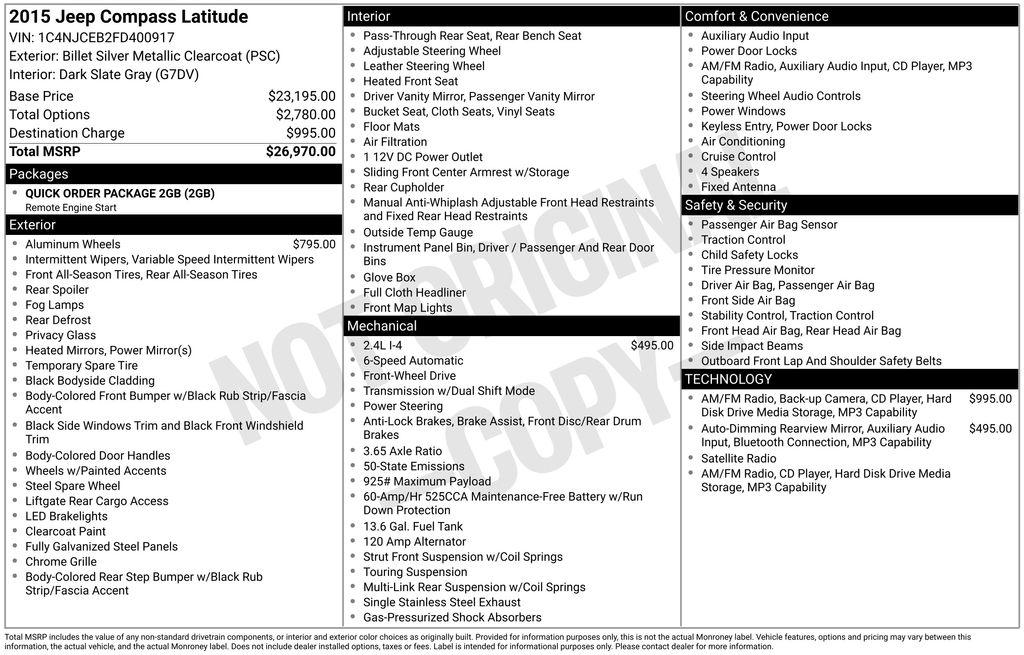 2015 Jeep Compass Latitude Billet Silver Metallic Clearcoat Latitude FWD 6-Speed Automatic 2.4L I4 DOHC 16V Dual VVT 1-Year SiriusXM Radio Service, 16" x 6.5" Aluminum Wheels, 17" x 6.5" Aluminum Wheels, 3.65 Axle Ratio, 4 Speakers, 40GB Hard Drive w/28GB Available, 6.5" Touchscreen Display, ABS brakes, Air Conditioning, Alloy wheels, AM/FM radio, Anti-whiplash front head restraints, Audio Jack Input for Mobile Devices, Brake assist, Bumpers: body-color, CD player, Cloth/Vinyl Low-Back Bucket Seats, Driver door bin, Driver vanity mirror, Dual front impact airbags, Dual front side impact airbags, Electronic Stability Control, Four wheel independent suspension, Front anti-roll bar, Front Bucket Seats, Front Center Armrest w/Storage, Front fog lights, Front reading lights, Heated door mirrors, Heated front seats, Illuminated entry, Kumho Brand Tires, Low tire pressure warning, Occupant sensing airbag, Outside temperature display, Overhead airbag, Panic alarm, ParkView Rear Back-Up Camera, Passenger door bin, Passenger vanity mirror, Power door mirrors, Power steering, Power windows, Quick Order Package 2GB, Radio: Uconnect 130 AM/FM/CD/MP3, Radio: Uconnect 430 CD/DVD/MP3/HDD, Rear anti-roll bar, Rear window defroster, Rear window wiper, Rear-View Auto-Dimming Mirror w/Microphone, Remote keyless entry, Remote Start System, Remote USB Port, Roof rack: rails only, SIRIUS Satellite Radio, Speed control, Split folding rear seat, Spoiler, Steering wheel mounted audio controls, Tachometer, Tilt steering wheel, Traction control, Uconnect Voice Command w/Bluetooth, Variably intermittent wipers.