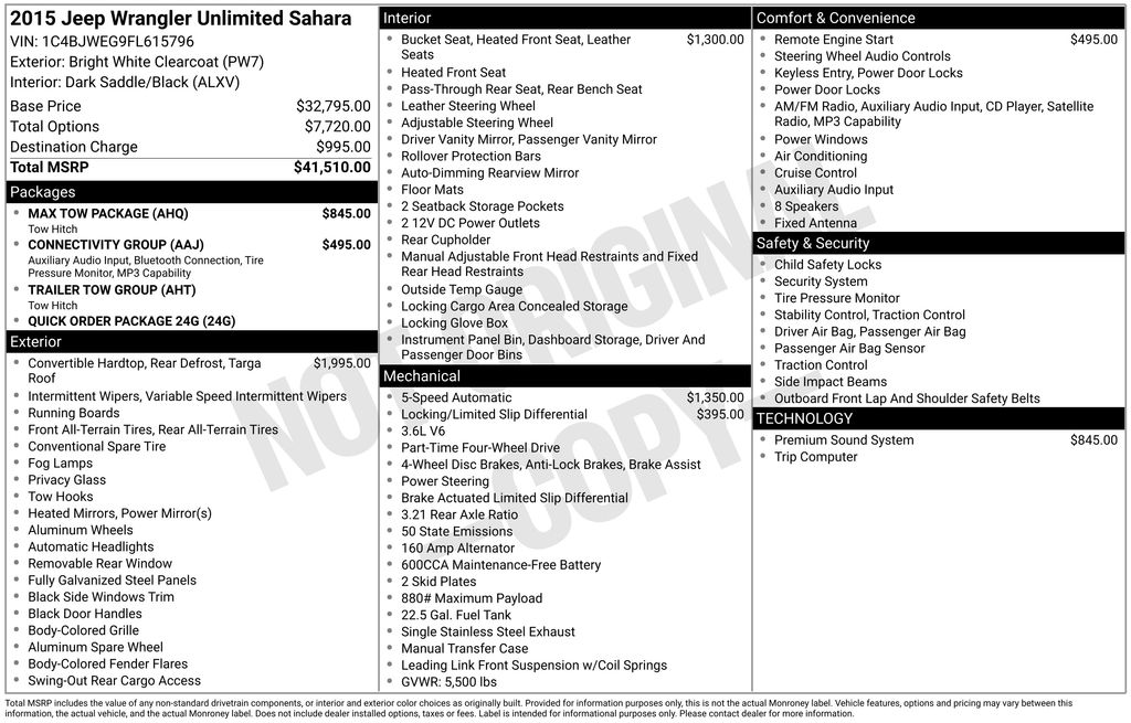 2015 Jeep Wrangler Unlimited Sahara Bright White Clearcoat Unlimited Sahara 4WD 5-Speed Automatic 3.6L V6 24V VVT 18" x 7.5" Polished Satin Carbon Wheels, 4-Wheel Disc Brakes, 8 Speakers, ABS brakes, Air Conditioning, Alloy wheels, Alpine 9-Speaker w/All Weather Subwoofer, AM/FM radio, Anti-Spin Differential Rear Axle, Audio Jack Input for Mobile Devices, Auto-dimming Rear-View mirror, Brake assist, CD player, Class II Receiver Hitch, Cloth Bucket Seats, Compass, Connectivity Group, Driver door bin, Driver vanity mirror, Dual front impact airbags, Electronic Stability Control, Front anti-roll bar, Front Bucket Seats, Front Center Armrest w/Storage, Front fog lights, Front reading lights, Fully automatic headlights, Heated door mirrors, Heated Front Seats, Heavy Duty Suspension w/Gas Shocks, Illuminated entry, Integrated roll-over protection, Leather steering wheel, Leather Wrapped Steering Wheel, Low tire pressure warning, Max Tow Package, Occupant sensing airbag, Outside temperature display, Panic alarm, Passenger door bin, Passenger vanity mirror, Power door mirrors, Power steering, Power windows, Quick Order Package 24G, Radio data system, Radio: Uconnect 130 AM/FM/CD/MP3, Rear anti-roll bar, Remote keyless entry, Remote Start System, Security system, Speed control, Split folding rear seat, Steering wheel mounted audio controls, Tachometer, Tilt steering wheel, Tire Pressure Monitoring Display, Traction control, Trailer Tow Group, Trailer Tow w/4-Pin Connector Wiring, Trip computer, Variably intermittent wipers, Vehicle Information Center.