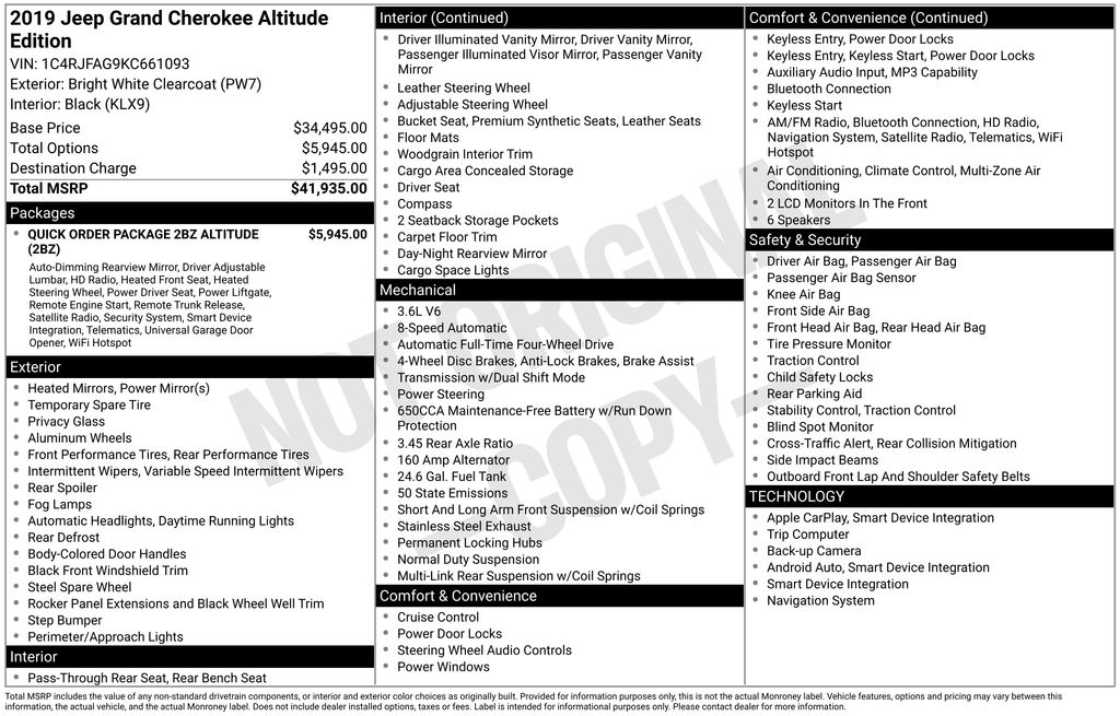 2019 Jeep Grand Cherokee Altitude Bright White Clearcoat Altitude 4WD 8-Speed Automatic 3.6L V6 24V VVT 4WD, 1-Year SiriusXM Radio Service, 1-Yr SiriusXM Guardian Trial, 115V Auxiliary Power Outlet, 3.45 Rear Axle Ratio, 4-Wheel Disc Brakes, 4G LTE Wi-Fi Hot Spot, 5-Year SiriusXM Traffic Service, 5-Year SiriusXM Travel Link Service, 6 Speakers, 8.4" Touchscreen Display, ABS brakes, Air Conditioning, Alloy wheels, Altitude Grille, Altitude IV Package, AM/FM radio, Anti-whiplash front head restraints, Apple CarPlay, Apple CarPlay/Android Auto, Auto-Dimming Rear-View Mirror, Automatic temperature control, Black Suede Seats w/Black Stitching, Body Color Claddings, Body Color Fascia, Body Color Shark Fin Antenna, Brake assist, Bumpers: body-color, Cargo Compartment Cover, Cloth Bucket Seats, Compass, Dark Day Light Opening Moldings, Dark Headlamp Bezel Finish, Dark Lens Taillamps, Delay-off headlights, Driver door bin, Driver vanity mirror, Dual front impact airbags, Dual front side impact airbags, Electronic Stability Control, Four wheel independent suspension, Front Accent/Body Color Fascia, Front anti-roll bar, Front Bucket Seats, Front Center Armrest w/Storage, Front dual zone A/C, Front fog lights, Front reading lights, Fully automatic headlights, Gloss Black Rear Fascia Applique, Google Android Auto, GPS Antenna Input, GPS Navigation, HD Radio, Heated door mirrors, Illuminated entry, Instrument Cluster w/Off-Road Disp. Pages, Integrated Center Stack Radio, Integrated Voice Command w/Bluetooth, Jeep Black Gloss Badging, Knee airbag, Leather Shift Knob, Low tire pressure warning, Normal Duty Suspension, Occupant sensing airbag, Outside temperature display, Overhead airbag, Overhead console, Panic alarm, ParkView Rear Back-Up Camera, Passenger door bin, Passenger vanity mirror, Power 4-Way Driver Lumbar Adjust, Power 8-Way Driver/Manual Passenger Seat, Power door mirrors, Power Liftgate, Power steering, Power windows, Quick Order Package 2BZ Altitude, Radio data system, Radio: Uconnect 4 w/7" Display, Radio: Uconnect 4C Nav w/8.4" Display, Rear Accent/Body Color Fascia, Rear anti-roll bar, Rear Fascia Black MIC Step Pad, Rear reading lights, Rear seat center armrest, Rear window defroster, Rear window wiper, Remote keyless entry, Security & Convenience Group, Security Alarm, Single Exhaust w/Bright Tip, SiriusXM Satellite Radio, SiriusXM Traffic Plus, SiriusXM Travel Link, Speed control, Speed-sensing steering, Speed-Sensitive Wipers, Split folding rear seat, Spoiler, Steering Wheel Mounted Audio Controls, Steering wheel mounted audio controls, Tachometer, Telescoping steering wheel, Tilt steering wheel, Traction control, Trip computer, Universal Garage Door Opener, USB Host Flip, Variably intermittent wipers, Wheels: 17" x 8.0" Silver Aluminum, Wheels: 20" x 8.0" Gloss Black Aluminum, 4WD.