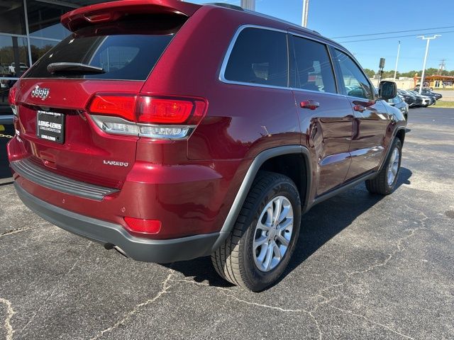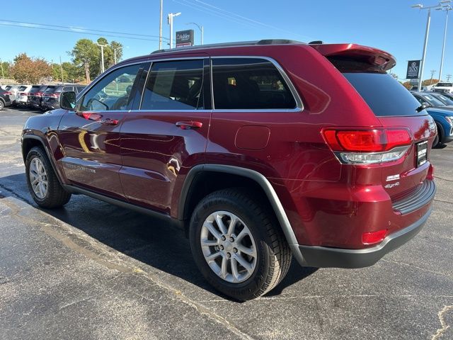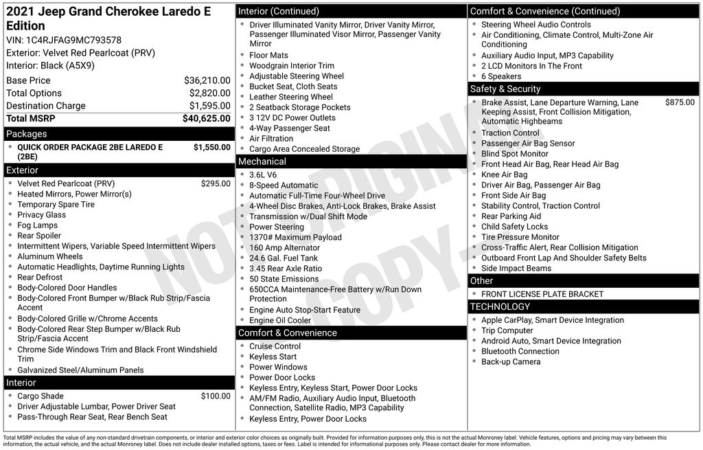 2021 Jeep Grand Cherokee Laredo E Velvet Red Pearlcoat Laredo E 4WD 8-Speed Automatic 3.6L V6 24V VVT 4WD, 3.45 Rear Axle Ratio, 4-Wheel Disc Brakes, 6 Speakers, ABS brakes, Advanced Brake Assist, Air Conditioning, Alloy wheels, AM/FM radio: SiriusXM, Anti-whiplash front head restraints, Apple CarPlay, Apple CarPlay/Android Auto, Auto High Beam Headlamp Control, Automatic temperature control, Brake assist, Bumpers: body-color, Cargo Compartment Cover, Cloth Bucket Seats, Compass, Delay-off headlights, Driver door bin, Driver vanity mirror, Dual front impact airbags, Dual front side impact airbags, Electronic Stability Control, Four wheel independent suspension, Front anti-roll bar, Front Bucket Seats, Front Center Armrest w/Storage, Front dual zone A/C, Front fog lights, Front License Plate Bracket, Front reading lights, Full Speed FWD Collision Warn Plus, Fully automatic headlights, Google Android Auto, GPS Antenna Input, Heated door mirrors, Illuminated entry, Integrated Voice Command w/Bluetooth, Knee airbag, Lane Departure Warning Plus, Leather Shift Knob, Low tire pressure warning, Normal Duty Suspension, Occupant sensing airbag, Outside temperature display, Overhead airbag, Overhead console, Panic alarm, ParkView Rear Back-Up Camera, Passenger door bin, Passenger vanity mirror, Power door mirrors, Power driver seat, Power steering, Power windows, Protech II, Quick Order Package 2BE Laredo E, Radio data system, Radio: Uconnect 4 w/7" Display, Rear anti-roll bar, Rear reading lights, Rear seat center armrest, Rear window defroster, Rear window wiper, Remote keyless entry, Roof rack: rails only, Speed control, Speed-sensing steering, Speed-Sensitive Wipers, Split folding rear seat, Spoiler, Steering Wheel Mounted Audio Controls, Steering wheel mounted audio controls, Tachometer, Telescoping steering wheel, Tilt steering wheel, Traction control, Trip computer, Variably intermittent wipers, Wheels: 18" x 8.0" Fine Silver Aluminum, 4WD.