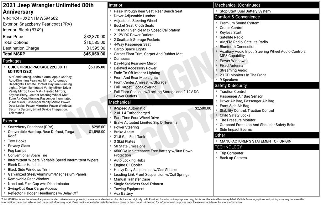 2021 Jeep Wrangler Unlimited Sport S Snazzberry Pearlcoat Unlimited Sport S 4WD 8-Speed Automatic 2.0L I4 DOHC ABS brakes, Compass, Electronic Stability Control, Low tire pressure warning, ParkView Rear Back-Up Camera, Traction control.