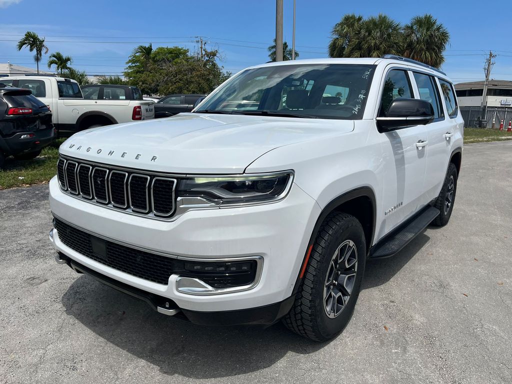 2023 Jeep Wagoneer L Series II Bright White Clearcoat Series II RWD 8-Speed Automatic 3.0L I6 10 Speakers, 3.55 Rear Axle Ratio, 3rd row seats: bench, 4-Wheel Disc Brakes, ABS brakes, Adjustable pedals, Air Conditioning, Alloy wheels, AM/FM radio: SiriusXM with 360L, Anti-whiplash front head restraints, Audio memory, Auto-dimming door mirrors, Auto-dimming Rear-View mirror, Auto-leveling suspension, Automatic temperature control, Brake assist, Bumpers: body-color, Compass, Delay-off headlights, Driver door bin, Driver vanity mirror, Driver's Seat Mounted Armrest, Dual front impact airbags, Dual front side impact airbags, Electronic Stability Control, Emergency communication system: Automatic SOS Call, Exterior Parking Camera Rear, Four wheel independent suspension, Front anti-roll bar, Front Bucket Seats, Front Center Armrest w/Storage, Front dual zone A/C, Front fog lights, Front reading lights, Fully automatic headlights, Garage door transmitter, Genuine wood console insert, Genuine wood dashboard insert, Genuine wood door panel insert, Heated door mirrors, Heated front seats, Heated steering wheel, Illuminated entry, Knee airbag, Leather Trimmed Bucket Seats, Low tire pressure warning, Memory seat, Navigation System, Normal Duty Suspension, Occupant sensing airbag, Outside temperature display, Overhead airbag, Overhead console, Panic alarm, Passenger door bin, Passenger seat mounted armrest, Passenger vanity mirror, Pedal memory, Power adjustable front head restraints, Power door mirrors, Power driver seat, Power Liftgate, Power passenger seat, Power steering, Power windows, Quick Order Package 25J, Radio data system, Radio: Uconnect 5 Nav w/10.1" Display, Rain sensing wipers, Rear air conditioning, Rear anti-roll bar, Rear reading lights, Rear seat center armrest, Rear window defroster, Rear window wiper, Reclining 3rd row seat, Remote keyless entry, Security system, Speed control, Speed-sensing steering, Speed-Sensitive Wipers, Split folding rear seat, Steering wheel memory, Steering wheel mounted audio controls, Tachometer, Telescoping steering wheel, Tilt steering wheel, Traction control, Trip computer, Turn signal indicator mirrors, Variably intermittent wipers, Ventilated front seats, Voltmeter, Wheels: 20" x 9.0" Premium 2 Aluminum.