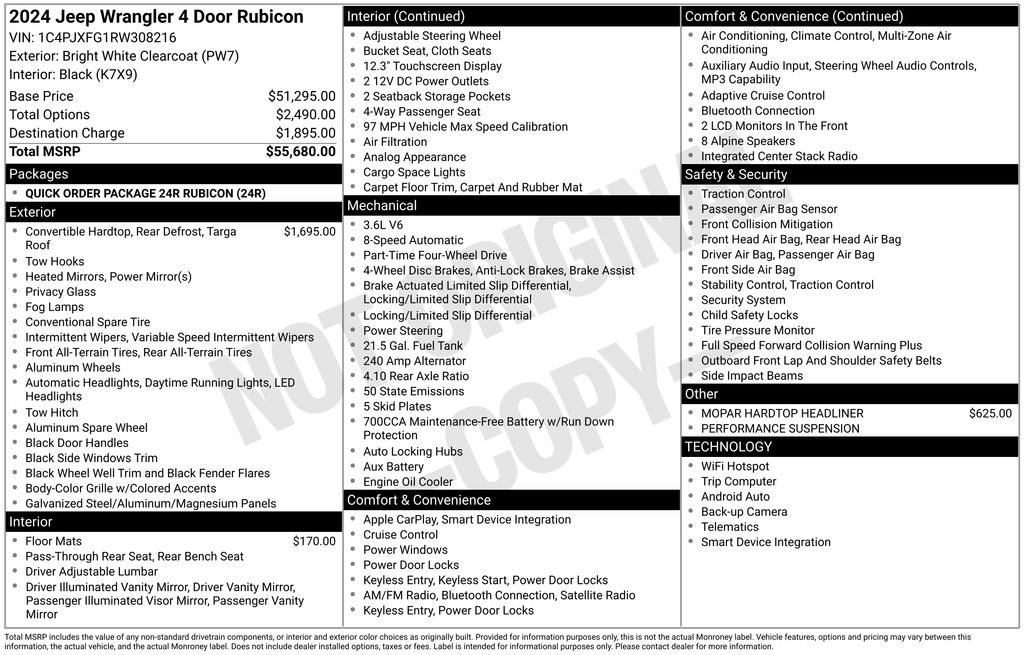 2024 Jeep Wrangler Rubicon Bright White Clearcoat Rubicon 4WD 8-Speed Automatic 3.6L V6 24V VVT 12.3" Touchscreen Display, 4-Wheel Disc Brakes, 4.10 Rear Axle Ratio, 8 Speakers, 97 MPH Vehicle Max Speed Calibration, ABS brakes, Air Conditioning, Alloy wheels, AM/FM radio: SiriusXM, Apple CarPlay, Apple CarPlay/Android Auto, Automatic temperature control, Aux Battery, Black 3-Piece Hard Top, Brake assist, Cloth Low-Back Bucket Seats, Compass, Connectivity - US/Canada, Delay-off headlights, Disassociated Touchscreen Display, Driver door bin, Driver vanity mirror, Dual front impact airbags, Dual front side impact airbags, Electronic Stability Control, Emergency communication system: Jeep Connect, Freedom Panel Storage Bag, Front anti-roll bar, Front Bucket Seats, Front Center Armrest w/Storage, Front dual zone A/C, Front fog lights, Front reading lights, Fully automatic headlights, Google Android Auto, Heated door mirrors, Illuminated entry, Integrated Center Stack Radio, Integrated roll-over protection, Integrated Voice Command w/Bluetooth, Low tire pressure warning, MOPAR All-Weather Floor Mats, MOPAR Hardtop Headliner, No Soft Top, Non-Lock Fuel Cap w/o Discriminator, Occupant sensing airbag, Outside temperature display, Overhead airbag, Panic alarm, ParkView Rear Back-Up Camera, Passenger door bin, Passenger vanity mirror, Performance Suspension, Power door mirrors, Power steering, Power windows, Quick Order Package 24R Rubicon, Radio data system, Radio: Uconnect 5 w/12.3" Display, Rear anti-roll bar, Rear reading lights, Rear Window Defroster, Rear Window Wiper/Washer, Remote keyless entry, Security system, Speed control, Split folding rear seat, Steering wheel mounted audio controls, Stop-Start Dual Battery System, Tachometer, Telescoping steering wheel, Tilt steering wheel, Traction control, Trip computer, Variably intermittent wipers, Voltmeter, Wheels: 17" x 7.5" Machined/Painted Black.