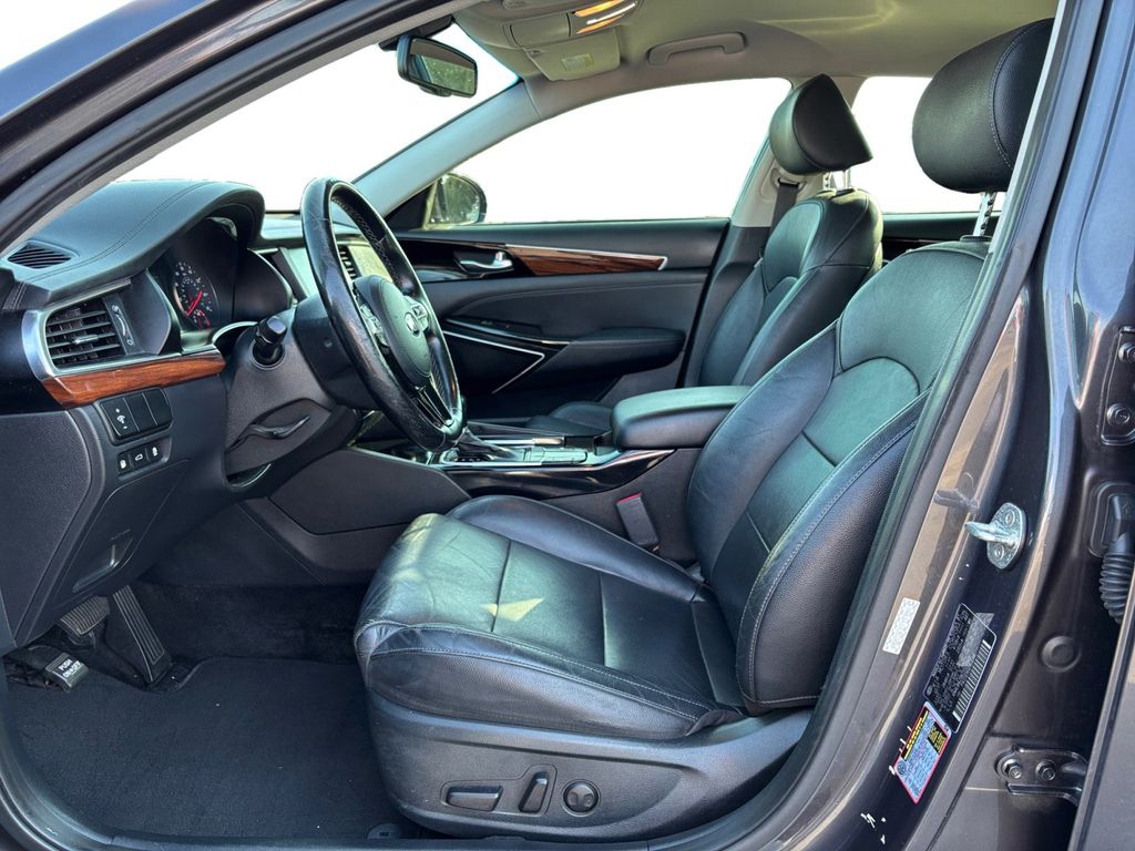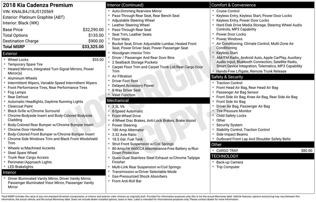 2018 Kia Cadenza Premium Platinum Graphite Premium FWD 8-Speed Automatic 3.3L DOHC 4-Wheel Disc Brakes, 7.5J x 18" Alloy Wheels, 8 Speakers, ABS brakes, Air Conditioning, Alloy wheels, AM/FM radio: SiriusXM, Apple CarPlay & Android Auto, Auto-dimming Rear-View mirror, Automatic temperature control, Brake assist, Bumpers: body-color, Cargo Tray, Delay-off headlights, Driver door bin, Driver vanity mirror, Dual front impact airbags, Dual front side impact airbags, Electronic Stability Control, Emergency communication system: UVO eServices, Exterior Parking Camera Rear, Four wheel independent suspension, Front anti-roll bar, Front Bucket Seats, Front Center Armrest, Front dual zone A/C, Front fog lights, Front reading lights, Fully automatic headlights, Heated door mirrors, Heated Front Bucket Seats, Heated front seats, Illuminated entry, Knee airbag, Leather Seat Trim, Leather Shift Knob, Low tire pressure warning, Occupant sensing airbag, Outside temperature display, Overhead airbag, Overhead console, Panic alarm, Passenger door bin, Passenger vanity mirror, Power door mirrors, Power driver seat, Power passenger seat, Power steering, Power windows, Radio data system, Radio: AM/FM/MP3 UVO eServices Infotainment System, Rear reading lights, Rear seat center armrest, Rear side impact airbag, Rear window defroster, Remote keyless entry, Security system, Speed control, Steering wheel mounted audio controls, Tachometer, Telescoping steering wheel, Tilt steering wheel, Traction control, Trip computer, Turn signal indicator mirrors, Variably intermittent wipers, Wheel Locks.