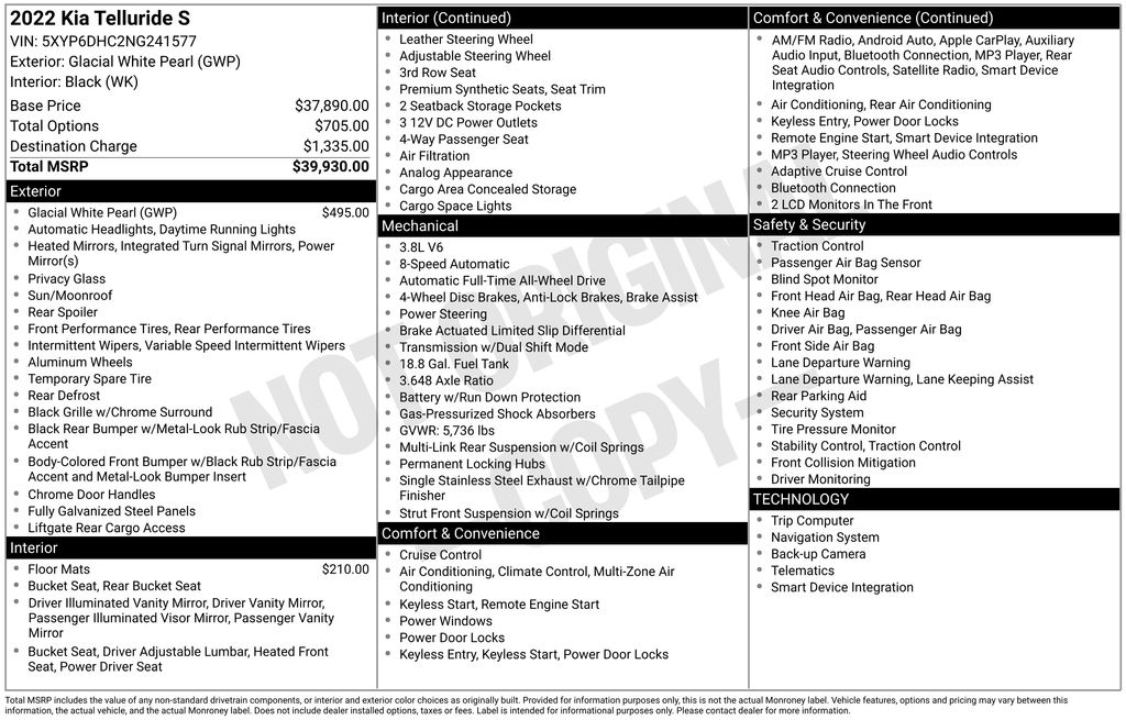 2022 Kia Telluride S Glacial White Pearl S AWD 8-Speed Automatic 3.8L V6 DOHC 20" x 7.5" Machined Alloy Wheels, 3.648 Axle Ratio, 3rd row seats: split-bench, 4-Wheel Disc Brakes, 6 Speakers, ABS brakes, Air Conditioning, Alloy wheels, AM/FM radio: SiriusXM, Apple CarPlay & Android Auto, Automatic temperature control, Brake assist, Bumpers: body-color, Carpeted Floor Mats, Delay-off headlights, Driver door bin, Driver vanity mirror, Dual front impact airbags, Dual front side impact airbags, Electronic Stability Control, Emergency communication system: 911 Connect, Four wheel independent suspension, Front anti-roll bar, Front Bucket Seats, Front Center Armrest, Front dual zone A/C, Front reading lights, Fully automatic headlights, Heated door mirrors, Heated Front Bucket Seats, Heated front seats, Illuminated entry, Knee airbag, Leather Shift Knob, Leather steering wheel, Low tire pressure warning, Navigation System, Occupant sensing airbag, Outside temperature display, Overhead airbag, Overhead console, Panic alarm, Passenger door bin, Passenger vanity mirror, Power door mirrors, Power driver seat, Power moonroof, Power steering, Power windows, Radio data system, Radio: AM/FM Display Audio System, Rear air conditioning, Rear anti-roll bar, Rear audio controls, Rear reading lights, Rear window defroster, Rear window wiper, Reclining 3rd row seat, Remote keyless entry, Roof rack: rails only, Security system, Smart Key w/ Push Button and Remote Start, Speed control, Speed-sensing steering, Split folding rear seat, Spoiler, Steering wheel mounted audio controls, Synthetic Leather Seat Trim, Tachometer, Telescoping steering wheel, Tilt steering wheel, Traction control, Trip computer, Turn signal indicator mirrors, Variably intermittent wipers.