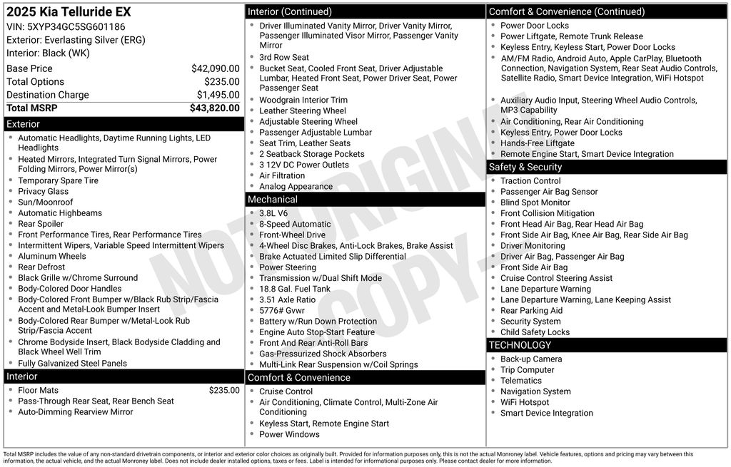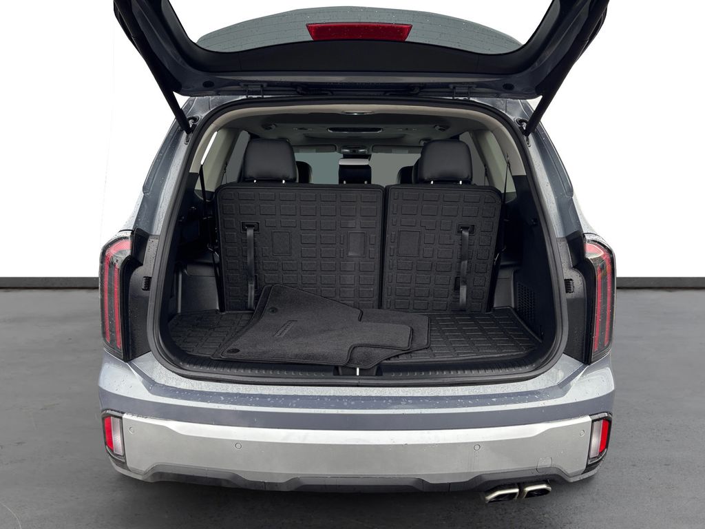 2025 Kia Telluride EX Everlasting Silver EX FWD 8-Speed Automatic 3.8L V6 DOHC 3rd row seats: split-bench, 4-Wheel Disc Brakes, ABS brakes, Air Conditioning, Alloy wheels, AM/FM radio: SiriusXM, Apple CarPlay & Android Auto, Auto High-beam Headlights, Auto-dimming Rear-View mirror, Automatic temperature control, Brake assist, Bumpers: body-color, Carpeted Floor Mats, Compass, Delay-off headlights, Driver door bin, Driver vanity mirror, Dual front impact airbags, Dual front side impact airbags, Electronic Stability Control, Emergency communication system: 911 Connect, Exterior Parking Camera Rear, Four wheel independent suspension, Front anti-roll bar, Front Bucket Seats, Front Center Armrest, Front dual zone A/C, Front reading lights, Fully automatic headlights, Heated & Ventilated Front Bucket Seats, Heated door mirrors, Heated front seats, Illuminated entry, Knee airbag, Leather Seat Trim, Leather Shift Knob, Leather steering wheel, Low tire pressure warning, Navigation System, Occupant sensing airbag, Outside temperature display, Overhead airbag, Overhead console, Panic alarm, Passenger door bin, Passenger vanity mirror, Power door mirrors, Power driver seat, Power Liftgate, Power moonroof, Power passenger seat, Power steering, Power windows, Radio data system, Rear air conditioning, Rear anti-roll bar, Rear audio controls, Rear reading lights, Rear seat center armrest, Rear side impact airbag, Rear window defroster, Rear window wiper, Reclining 3rd row seat, Remote keyless entry, Security system, Speed control, Speed-sensing steering, Split folding rear seat, Spoiler, Steering wheel mounted audio controls, Tachometer, Telescoping steering wheel, Tilt steering wheel, Traction control, Trip computer, Turn signal indicator mirrors, Variably intermittent wipers, Ventilated front seats, Wheels: 20" x 7.5" Black Finish.