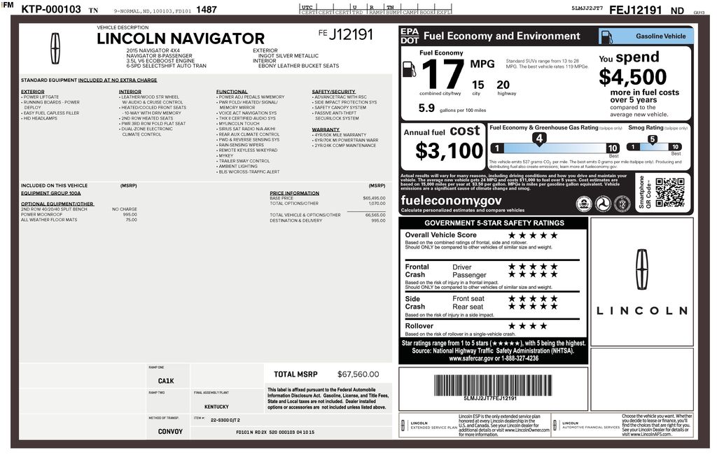 2015 Lincoln Navigator Base Ingot Silver 4WD 6-Speed Automatic 3.5L V6 4WD, Ebony Leather, 14 Speakers, 1st & 2nd Row Ebony All-Weather Floor Mats, 2nd Row Heated 40/20/40 Leather Split Bench Seat, 3.73 Rear Axle Ratio, 3rd row seats: split-bench, 4-Wheel Disc Brakes, ABS brakes, Adaptive suspension, Adjustable pedals, Air Conditioning, Alloy wheels, AM/FM radio: SiriusXM, Auto-dimming door mirrors, Auto-dimming Rear-View mirror, Auto-leveling suspension, Automatic temperature control, Bumpers: body-color, CD player, Compass, Delay-off headlights, Driver door bin, Driver vanity mirror, Dual front impact airbags, Dual front side impact airbags, DVD-Audio, Electronic Stability Control, Equipment Group 100A Select, Exterior Parking Camera Rear, Four wheel independent suspension, Front anti-roll bar, Front Bucket Seats, Front Center Armrest, Front dual zone A/C, Front reading lights, Fully automatic headlights, Garage door transmitter, Genuine wood console insert, Genuine wood dashboard insert, Genuine wood door panel insert, Heated door mirrors, Heated front seats, Heated rear seats, High-Intensity Discharge Headlights, Illuminated entry, Leather steering wheel, Low tire pressure warning, Memory seat, Navigation System, Outside temperature display, Overhead airbag, Overhead console, Panic alarm, Passenger door bin, Passenger vanity mirror, Pedal memory, Power door mirrors, Power driver seat, Power Liftgate, Power Moonroof, Power passenger seat, Power steering, Power windows, Premium audio system: THX II, Premium Leather Low Back Bucket Seats, Radio data system, Radio: HD w/Single CD/DVD Player, Rain sensing wipers, Rear air conditioning, Rear anti-roll bar, Rear audio controls, Rear reading lights, Rear window defroster, Rear window wiper, Reclining 3rd row seat, Remote keyless entry, Roof rack, Security system, SIRIUS Satellite Radio, Speed control, Speed-sensing steering, Speed-Sensitive Wipers, Steering wheel memory, Steering wheel mounted audio controls, SYNC w/MyLincoln Touch, Tachometer, Telescoping steering wheel, Tilt steering wheel, Traction control, Trip computer, Turn signal indicator mirrors, Variably intermittent wipers, Ventilated front seats, Wheels: 20" Ultra Brite Machined Aluminum, 4WD, Ebony Leather.