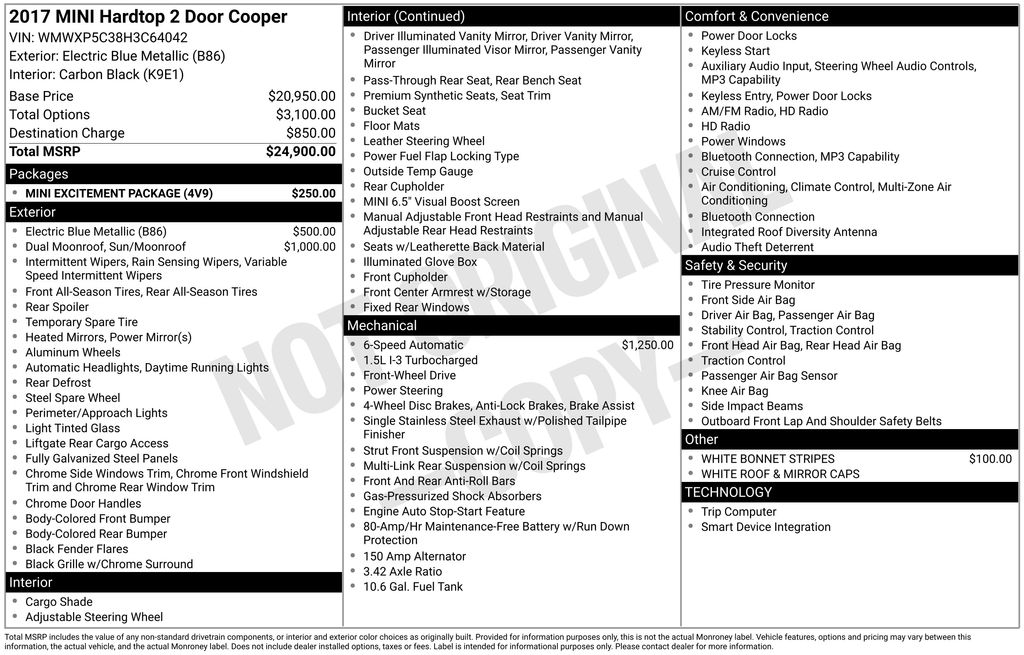 2017 MINI Cooper Base Blue FWD 6-Speed 1.5L 12V TwinPower Turbo 4-Wheel Disc Brakes, 6 Speakers, ABS brakes, Air Conditioning, Alloy wheels, AM/FM radio, AM/FM Stereo, Automatic temperature control, Brake assist, Bumpers: body-color, Delay-off headlights, Driver door bin, Driver vanity mirror, Dual front impact airbags, Dual front side impact airbags, Electronic Stability Control, Enhanced USB & Bluetooth, Four wheel independent suspension, Front anti-roll bar, Front Bucket Seats, Front Center Armrest w/Storage, Front dual zone A/C, Front reading lights, Fully automatic headlights, Heated door mirrors, Illuminated entry, Knee airbag, Leather steering wheel, Low tire pressure warning, MINI 6.5" Visual Boost Screen, MINI Connected, Occupant sensing airbag, Outside temperature display, Overhead airbag, Overhead console, Passenger door bin, Passenger vanity mirror, Power door mirrors, Power steering, Power windows, Radio data system, Rain sensing wipers, Rear anti-roll bar, Rear window defroster, Rear window wiper, Remote keyless entry, Speed control, Speed-sensing steering, Speed-Sensitive Wipers, Split folding rear seat, Spoiler, Sport steering wheel, Steering wheel mounted audio controls, Tachometer, Telescoping steering wheel, Tilt steering wheel, Traction control, Trip computer, Variably intermittent wipers, Wheels: 15" x 5.5" Heli Spoke Silver.