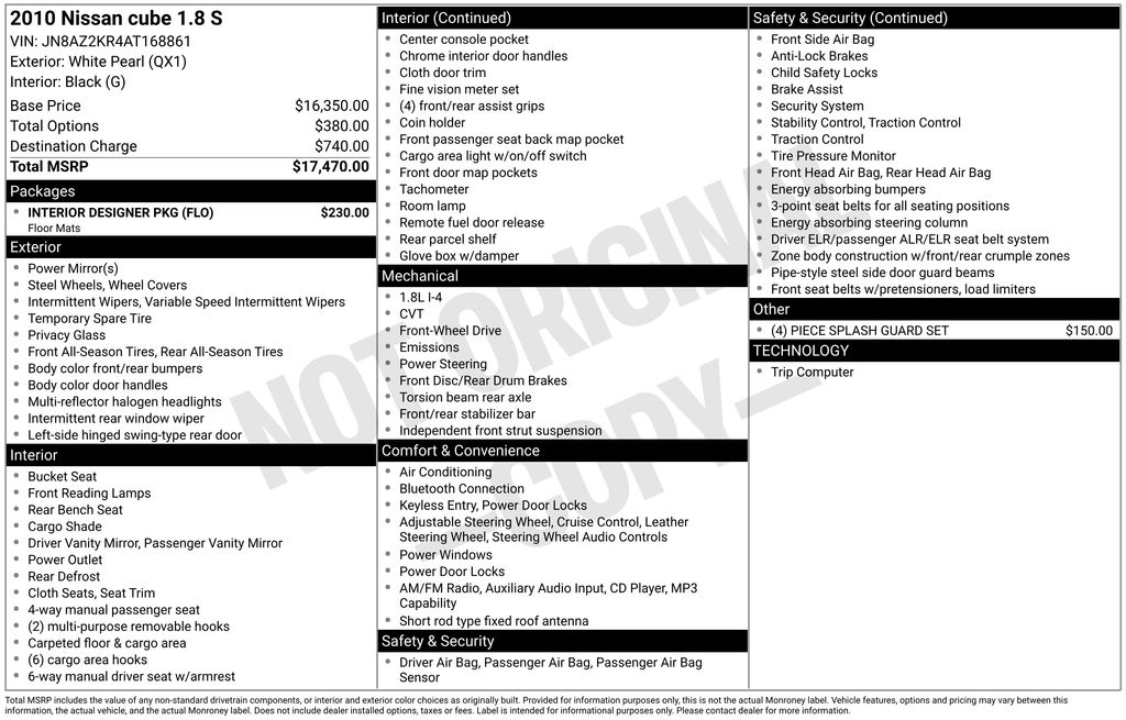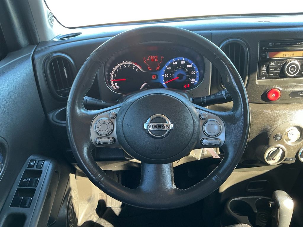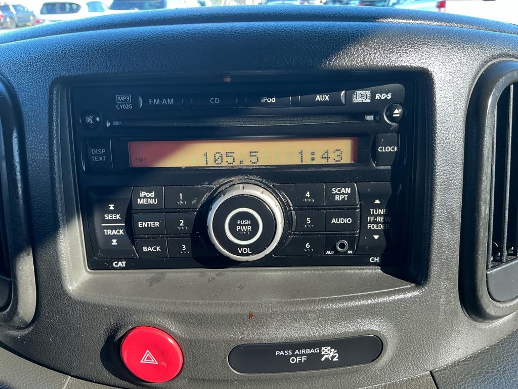 2010 Nissan Cube 1.8 S Phantom White Pearl 1.8 S FWD CVT 1.8L 4-Cylinder DOHC 16V 15" Steel Wheels w/Full Covers, 6 Speakers, ABS brakes, Air Conditioning, AM/FM radio, AM/FM/CD Radio, Anti-whiplash front head restraints, Brake assist, Bumpers: body-color, Carpeted Cargo Area Mat, Carpeted Floor Mats, CD player, Driver door bin, Driver vanity mirror, Dual front impact airbags, Dual front side impact airbags, Electronic Stability Control, Front anti-roll bar, Front Bucket Seats, Front reading lights, Front wheel independent suspension, Illuminated entry, Interior Design Package, Leather steering wheel, Low tire pressure warning, Occupant sensing airbag, Overhead airbag, Panic alarm, Passenger door bin, Passenger vanity mirror, Power door mirrors, Power steering, Power windows, Premium-Grade Fabric, Radio data system, Rear anti-roll bar, Rear seat center armrest, Rear window defroster, Rear window wiper, Remote keyless entry, Security system, Speed control, Speed-sensing steering, Splash Guards (4-Piece Body-Colored Set), Split folding rear seat, Steering wheel mounted audio controls, Tachometer, Tilt steering wheel, Traction control, Trip computer, Variably intermittent wipers.