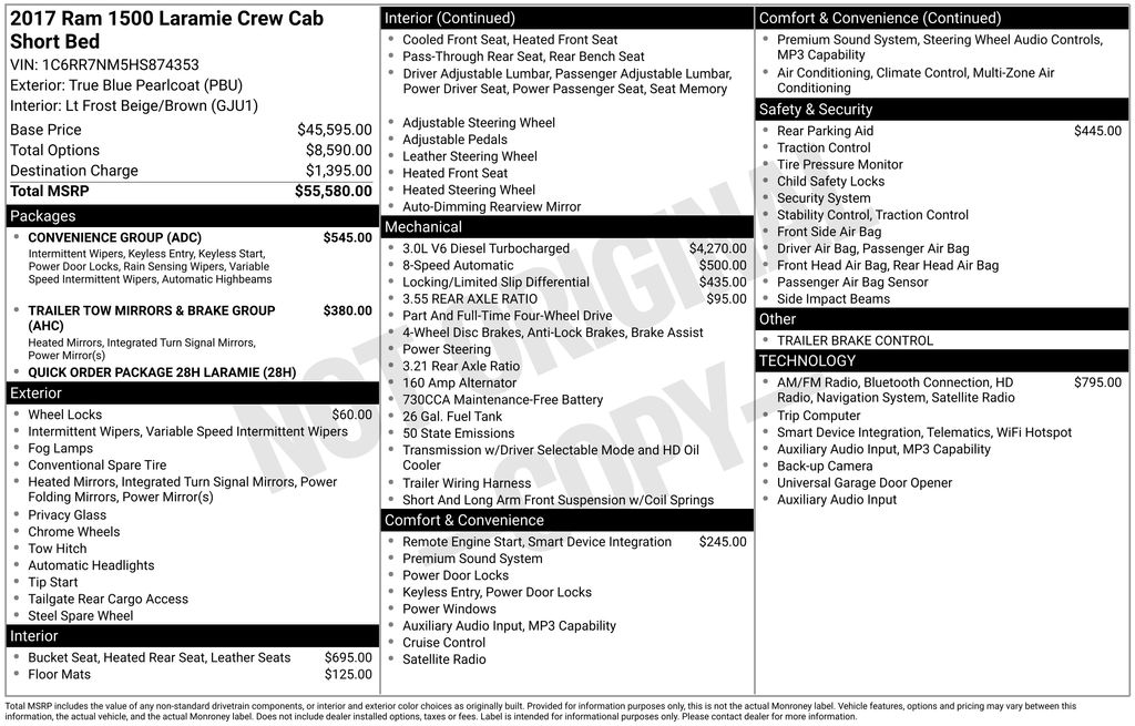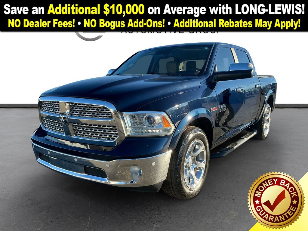 2017 Ram 1500 Laramie True Blue Pearlcoat Laramie 4WD 8-Speed Automatic EcoDiesel 3.0L V6 1 Yr. Trial (Registration Required), 10 Speakers, 115V Auxiliary Power Outlet, 20" x 9" Chrome Clad Aluminum Wheels, 4-Wheel Disc Brakes, 5-Year SiriusXM Traffic Service, 5-Year SiriusXM Travel Link Service, 8.4" Touchscreen Display, ABS brakes, Active Grille Shutters, Adjustable pedals, Air Conditioning, Alloy wheels, AM/FM radio, Anti-Spin Differential Rear Axle, Audio Jack Input for Mobile Devices, Audio memory, Auto High Beam Headlamp Control, Auto-dimming door mirrors, Auto-dimming Rear-View mirror, Automatic temperature control, Body Color Fender Flares, Brake assist, Bright Rotary Shifter, Bumpers: chrome, Center Hub, Compass, Convenience Group, Delay-off headlights, Driver door bin, Driver vanity mirror, Dual front impact airbags, Dual front side impact airbags, Electronic Shift, Electronic Stability Control, Emergency communication system: Uconnect Access, Folding Flat Load Floor Storage, Front & Rear Rubber Floor Mats, Front anti-roll bar, Front Center Armrest w/Storage, Front dual zone A/C, Front fog lights, Front reading lights, Front wheel independent suspension, Fully automatic headlights, Garage door transmitter, GPS Antenna Input, GPS Navigation, HD Radio, Heated door mirrors, Heated Front Seats, Heated front seats, Heated Steering Wheel, Heated steering wheel, High Back Seats, Illuminated entry, Integrated Voice Command w/Bluetooth, Keyless Enter-N-Go, Leather steering wheel, Leather Trim 40/20/40 Bench Seat, Low tire pressure warning, Media Hub (USB, AUX), Memory seat, Occupant sensing airbag, Outside temperature display, Overhead airbag, Overhead console, Panic alarm, ParkSense Front/Rear Park Assist System, ParkView Rear Back-Up Camera, Passenger door bin, Passenger vanity mirror, Pedal memory, Power 10-Way Memory Driver & 6-Way Passenger Seats, Power Chrome Trailer Tow Mirrors, Power door mirrors, Power driver seat, Power passenger seat, Power steering, Power windows, Quick Order Package 28H Laramie, Radio data system, Radio: Uconnect 3C Nav w/8.4" Display, Radio: Uconnect 3C w/8.4" Display, Rain Sensitive Windshield Wipers, Rear 60/40 Split Folding Seat, Rear anti-roll bar, Rear seat center armrest, Rear step bumper, Remote keyless entry, Remote Proximity Keyless Entry, Remote Start System, Remote USB Port, Security system, SIRIUSXM Satellite Radio, SIRIUSXM Traffic, SiriusXM Travel Link, Speed control, Split folding rear seat, Steering wheel mounted audio controls, Tachometer, Tilt steering wheel, Tip Start, Traction control, Trailer Brake Control, Trailer Tow Mirrors, Trailer Tow Mirrors & Brake Group, Trip computer, Turn signal indicator mirrors, Uconnect Access, Uconnect Access 1 Year Trial, Variably intermittent wipers, Ventilated Front Seats, Ventilated front seats, Voltmeter.