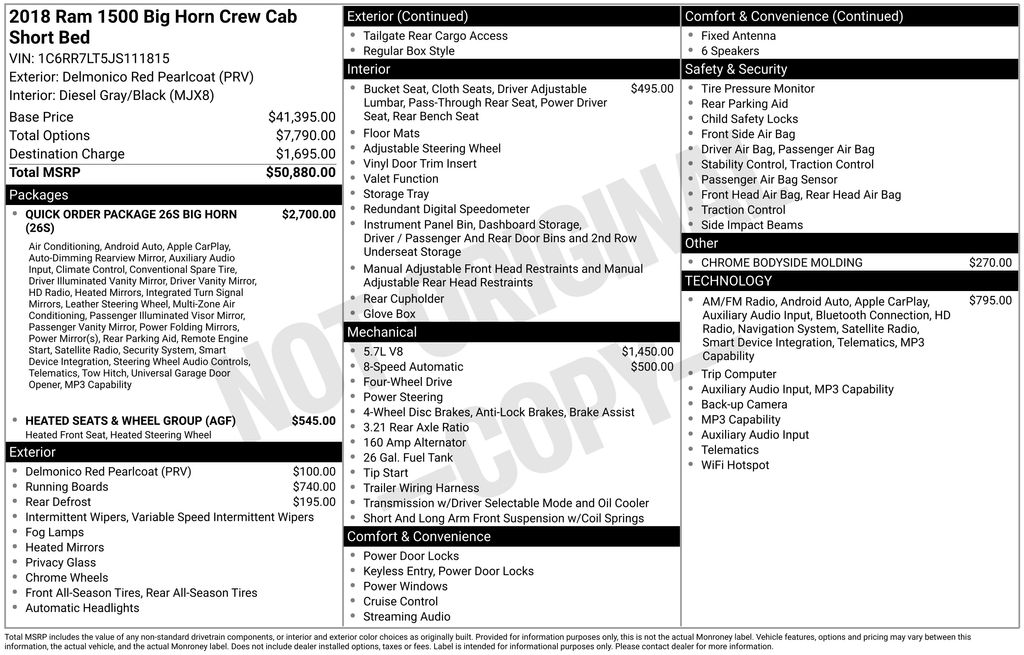 2018 Ram 1500 Big Horn Delmonico Red Pearlcoat Big Horn 4WD 8-Speed Automatic HEMI 5.7L V8 Multi Displacement VVT 1-Yr SiriusXM Guardian Trial, 115V Auxiliary Power Outlet, 3.21 Rear Axle Ratio, 4-Wheel Disc Brakes, 40/20/40 Split Bench Seat, 5-Year SiriusXM Traffic Service, 5-Year SiriusXM Travel Link Service, 6 Speakers, 8.4" Touchscreen Display, ABS brakes, Active Grille Shutters, Air Conditioning, Air Conditioning ATC w/Dual Zone Control, Alloy wheels, AM/FM radio: SiriusXM, Apple CarPlay, Audio Jack Input for Mobile Devices, Auto-Dimming Exterior Mirrors, Auto-Dimming Rear-View Mirror, Big Horn Badge, Big Horn Regional Package, Black Exterior Mirrors, Brake assist, Bright/Bright Billets Grille, Bumpers: chrome, Center Hub, Charge Only Remote USB Port, Chrome Bodyside Molding, Class IV Receiver Hitch (DISC), Compass, Delay-off headlights, Driver door bin, Dual front impact airbags, Dual front side impact airbags, Dual Rear Exhaust w/Bright Tips, Electric Shift-On-Demand Transfer Case, Electroluminescent Instrument Cluster, Electronic Shift, Electronic Stability Control, Exterior Mirrors Courtesy Lamps, Exterior Mirrors w/Heating Element, Exterior Mirrors w/Supplemental Signals, Folding Flat Load Floor Storage, Front anti-roll bar, Front Armrest w/3 Cupholders, Front Center Armrest w/Storage, Front Center Seat Cushion Storage, Front Fog Lamps, Front reading lights, Front wheel independent suspension, Fully automatic headlights, Glove Box Lamp, Google Android Auto, GPS Antenna Input, GPS Navigation, HD Radio, Heated door mirrors, Heated Front Seats, Heated Seats & Wheel Group, Heated Steering Wheel, Humidity Sensor, Illuminated entry, Integrated Voice Command w/Bluetooth, Leather Wrapped Steering Wheel, LED Bed Lighting, Low tire pressure warning, Media Hub (2 USB, AUX), Occupant sensing airbag, Outside temperature display, Overhead airbag, Overhead console, Overhead Console w/Garage Door Opener, Panic alarm, ParkSense Front/Rear Park Assist System, ParkSense Rear Park Assist System, ParkView Rear Back-Up Camera, Passenger door bin, Passenger vanity mirror, Power 10-Way Driver Seat, Power door mirrors, Power Heated Fold-Away Mirrors, Power Lumbar Adjust, Power steering, Power windows, Power-Folding Mirrors, Premium Cloth 40/20/40 Bench Seat, Quick Order Package 26S Big Horn (DISC), Radio data system, Radio: Uconnect 4C Nav w/8.4" Display, Radio: Uconnect 4C w/8.4" Display, Rear 60/40 Split Folding Seat, Rear anti-roll bar, Rear Dome w/On/Off Switch Lamp, Rear Floor Mats, Rear Power Sliding Window, Rear seat center armrest, Rear step bumper, Rear Window Defroster, Remote keyless entry, Remote Start System, Remote USB Port, Security Alarm, SiriusXM Satellite Radio, SiriusXM Traffic Plus, SiriusXM Travel Link, Speed control, Steering Wheel Mounted Audio Controls, Storage Tray, Sun Visors w/Illuminated Vanity Mirrors, Tachometer, Tilt steering wheel, Tip Start, Traction control, Trip computer, Universal Garage Door Opener, USB Host Flip, Variably intermittent wipers, Voltmeter, Wheel to Wheel Side Steps, Wheels: 20" x 8" Aluminum Chrome Clad.