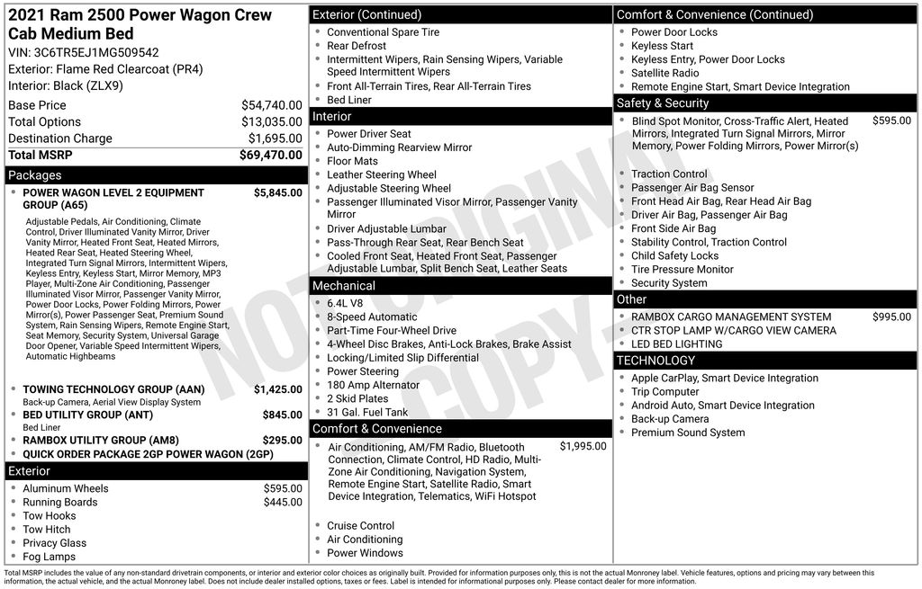 2021 Ram 2500 Power Wagon Flame Red Clearcoat Power Wagon 4WD 8-Speed Automatic 6.4L V8 #1 Seat Foam Cushion, 1-Year SiriusXM Guardian Trial, 115V Auxiliary Rear Power Outlet, 12" Touchscreen Display, 2 Way Rear Headrest Seat, 2nd Row In Floor Storage Bins, 4 Adjustable Cargo Tie-Down Hooks, 4 Way Front Headrests, 4-Wheel Disc Brakes, 4.10 Axle Ratio, 40/20/40 Split Bench Seat, 4G LTE Wi-Fi Hot Spot, 5-Year SiriusXM Traffic Service, 5-Year SiriusXM Travel Link Service, 6 Speakers, 8.4" Touchscreen Display, 9 Alpine Speakers w/Subwoofer, ABS brakes, Air Conditioning, Air Conditioning ATC w/Dual Zone Control, Alloy wheels, AM/FM radio: SiriusXM, Apple CarPlay, Apple CarPlay/Android Auto, Auto High Beam Headlamp Control, Auto-dimming Rear-View mirror, Bed Utility Group, Black Exterior Mirrors, Black Wheel Center Hub, Blind Spot & Cross Path Detection (DISC), Block heater, Body Color Door Handles, Brake assist, Cloth Power Bench Seat w/Emboss Tread Pattern, Compass, CTR Stop Lamp w/Cargo View Camera, Delay-off headlights, Disassociated Touchscreen Display, Driver door bin, Dual front impact airbags, Dual front side impact airbags, Electronic Stability Control, Exterior Mirrors w/Memory, Foam Bottle Insert (Door Trim Panel), Folding Flat Load Floor Storage, For Details Visit DriveUconnect.com, Front anti-roll bar, Front Armrest w/Cupholders, Front Center Armrest w/Storage, Front Center Seat Cushion Storage, Front Door Accent Lighting, Front fog lights, Front reading lights, Front Seat Back Map Pockets, Fully automatic headlights, Google Android Auto, GPS Antenna Input, GPS Navigation, HD Radio, Heated door mirrors, Heated Front Seats, Heated Second Row Seats, Heated Steering Wheel, High Back Seats, Illuminated entry, Integrated Center Stack Radio, Integrated Voice Command w/Bluetooth, Leather steering wheel, Leather Trim 40/20/40 Bench Seat, LED Bed Lighting, LED Dome Lamp w/On/Off Switch, LED Interior Lighting, Low tire pressure warning, Media Hub w/2 Charge Only USBs, Mirror-Mounted Aux Reverse Lamps, Mopar Black Tubular Side Steps, MOPAR Deployable Bed Step, MOPAR Spray In Bedliner, Occupant sensing airbag, Off-Road Information Pages, Outside temperature display, Overhead airbag, Overhead console, Overhead LED Lamps, Panic alarm, ParkView Rear Back-Up Camera, Passenger door bin, Passenger vanity mirror, Power 2-Way Driver Lumbar Adjust, Power 2-Way Passenger Lumbar Adjust, Power Adjust 8-Way Front Passenger Seat, Power Adjustable Convex Aux Mirrors, Power Adjustable Pedals w/Memory, Power Black Tow Mirrors w/Convex Spotter & Memory, Power door mirrors, Power driver seat, Power steering, Power Wagon Level 2 Equipment Group, Power windows, Premium Overhead Console, Quick Order Package 2GP Power Wagon, Radio data system, Radio: Uconnect 12.0 w/Navigation, Radio: Uconnect 4 w/8.4" Display, Radio/Driver Seat/Mirrors/Pedals Memory, Rain sensing wipers, Rain Sensitive Windshield Wipers, RamBox Cargo Management System, RamBox Utility Group, Rear 60/40 Folding Seat, Rear anti-roll bar, Rear Door Accent Lighting, Rear seat center armrest, Rear step bumper, Rear window defroster, Remote keyless entry, Remote Proximity Keyless Entry, Remote Start System, Remote Tailgate Release, Security Alarm, SiriusXM Satellite Radio, SiriusXM Traffic Plus, SiriusXM Travel Link, SiriusXM w/360L, Speed control, Split folding rear seat, Steering wheel mounted audio controls, Sun Visors w/Illuminated Vanity Mirrors, Surround View Camera System, Tachometer, Tilt steering wheel, Towing Technology Group, Traction control, Trailer Reverse Guidance, Trip computer, Truck Bed Cargo Divider, Turn signal indicator mirrors, Universal Garage Door Opener, Variably intermittent wipers, Vendor Painted Cargo Box Tracking, Ventilated Front Seats, Voltmeter, Wheels: 17" x 8.0" Black Painted Aluminum, Wheels: 17" x 8.0" Matte Black/Diamond Cut.
