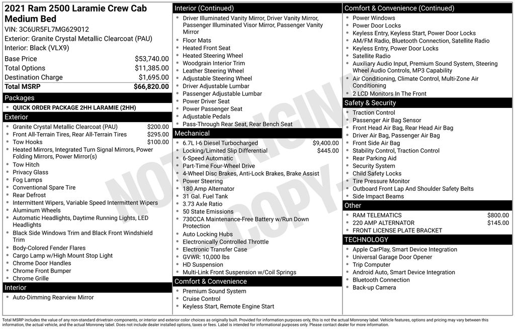 2021 Ram 2500 Laramie Granite Crystal Metallic Clearcoat Laramie 4WD 6-Speed Automatic Cummins 6.7L I6 Turbodiesel 1 Year Telematics Service, 10 Speakers, 115V Auxiliary Rear Power Outlet, 2 Way Rear Headrest Seat, 220 Amp Alternator, 3.73 Axle Ratio, 4 Way Front Headrests, 4-Wheel Disc Brakes, 8.4" Touchscreen Display, ABS brakes, Active Noise Control System, Adjustable pedals, Air Conditioning, Alloy wheels, AM/FM radio: SiriusXM, Anti-Spin Differential Rear Axle, Apple CarPlay, Apple CarPlay/Android Auto, Auto-dimming Rear-View mirror, Automatic temperature control, Brake assist, Bumpers: chrome, Compass, Delay-off headlights, Driver door bin, Driver vanity mirror, Dual front impact airbags, Dual front side impact airbags, Electronic Stability Control, Electronically Controlled Throttle, Front anti-roll bar, Front Center Armrest w/Storage, Front dual zone A/C, Front fog lights, Front License Plate Bracket, Front reading lights, Front Seat Back Map Pockets, Fully automatic headlights, Garage door transmitter, Google Android Auto, GPS Antenna Input, Heated door mirrors, Heated Front Seats, Heated front seats, Heated Steering Wheel, Heated steering wheel, Illuminated entry, Integrated Center Stack Radio, Integrated Voice Command w/Bluetooth, Leather steering wheel, Leather Trim 40/20/40 Bench Seat, Low tire pressure warning, Occupant sensing airbag, Outside temperature display, Overhead airbag, Overhead console, Panic alarm, ParkView Rear Back-Up Camera, Passenger door bin, Passenger vanity mirror, Power 2-Way Driver Lumbar Adjust, Power 2-Way Passenger Lumbar Adjust, Power Adjust 8-Way Driver Seat, Power Adjust 8-Way Front Passenger Seat, Power door mirrors, Power driver seat, Power passenger seat, Power steering, Power windows, Quick Order Package 2HH Laramie, Radio data system, Radio: Uconnect 4 w/8.4" Display, RAM Telematics, Rear 60/40 Folding Seat, Rear anti-roll bar, Rear reading lights, Rear seat center armrest, Rear step bumper, Rear window defroster, Remote keyless entry, Security system, SiriusXM Satellite Radio, Speed control, Split folding rear seat, Steering wheel mounted audio controls, Tachometer, Tilt steering wheel, Tip Start, Tow Hooks, Traction control, Trip computer, Turn signal indicator mirrors, Variably intermittent wipers, Vendor Painted Cargo Box Tracking, Voltmeter, Wheels: 18" x 8.0" Polished Aluminum.