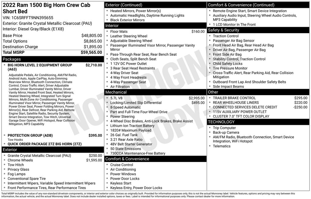 2022 Ram 1500 Big Horn/Lone Star Granite Crystal Metallic Clearcoat Big Horn/Lone Star 4WD 8-Speed Automatic HEMI 5.7L V8 Multi Displacement VVT 115V Auxiliary Power Outlet, 115V Auxiliary Rear Power Outlet, 2nd Row In Floor Storage Bins, 3 Rear Seat Head Restraints, 3.21 Rear Axle Ratio, 4 Way Front Headrests, 4-Wheel Disc Brakes, 400W Inverter, 48V Belt Starter Generator, 4G LTE Wi-Fi Hot Spot, 6 Speakers, 8.4" Touchscreen Display, ABS brakes, Air Conditioning, Air Conditioning ATC w/Dual Zone Control, Alloy wheels, AM/FM radio, Anti-Spin Differential Rear Axle, Apple CarPlay, Auto-Dimming Exterior Driver Mirror, Auto-Dimming Rear-View Mirror, Big Horn Badge, Big Horn Level 2 Equipment Group, Black Exterior Mirrors, Black Premium Power Mirrors, Bluetooth Handsfree Phone & Audio, Brake assist, Bumpers: chrome, Class IV Receiver Hitch, Cloth Bench Seat, Cluster 7.0" TFT Color Display, Compass, Connected Services Delete Credit, Connectivity - US/Canada, Convex Wide-Angle Mirror Insert, Delay-off headlights, Driver door bin, Dual front impact airbags, Dual front side impact airbags, Electronic Stability Control, Emergency communication system: SiriusXM Guardian, Exterior Mirrors Courtesy Lamps, Exterior Mirrors w/Heating Element, Exterior Mirrors w/Supplemental Signals, For Details, Visit DriveUconnect.com, Front anti-roll bar, Front Center Armrest w/Storage, Front fog lights, Front reading lights, Front Seat Back Map Pockets, Front wheel independent suspension, Fully automatic headlights, Global Telematics Box Module (TBM), Glove Box Lamp, Google Android Auto, GPS Antenna Input, Heated door mirrors, Heated Front Seats, Heated Steering Wheel, Heavy-Duty Engine Cooling, Illuminated entry, Integrated Center Stack Radio, Integrated Voice Command w/Bluetooth, Leather steering wheel, Low tire pressure warning, Media Hub w/2 Charge Only USBs, MOPAR Front & Rear Rubber Floor Mats, Occupant sensing airbag, Outside temperature display, Overhead airbag, Overhead console, Panic alarm, ParkSense Front/Rear Park Assist w/Stop, ParkView Rear Back-Up Camera, Passenger door bin, Passenger vanity mirror, Power 2-Way Driver Lumbar Adjust, Power 8-Way Driver Seat, Power Adjustable Pedals, Power door mirrors, Power steering, Power windows, Power-Folding Mirrors, Protection Group, Quick Order Package 27Z Big Horn, Radio data system, Radio: Uconnect 3 w/5" Display, Radio: Uconnect 5 W w/8.4" Display, Rear 60/40 Folding Seat, Rear anti-roll bar, Rear Dome w/On/Off Switch Lamp, Rear Power Sliding Window, Rear seat center armrest, Rear step bumper, Rear Wheelhouse Liners, Rear Window Defroster, Remote keyless entry, Remote Start System, Security Alarm, SiriusXM Radio Service, SiriusXM Satellite Radio, Speed control, Split folding rear seat, Steering wheel mounted audio controls, Sun Visors w/Illuminated Vanity Mirrors, Tachometer, Telescoping steering wheel, Tilt steering wheel, Tow Hooks, Traction control, Trailer Brake Control, Trip computer, Universal Garage Door Opener, USB Host Flip, Variably intermittent wipers, Voltmeter, Wheels: 18" x 8" Cast-Aluminum Painted, Wheels: 20" x 9" Aluminum Chrome Clad (WRK).