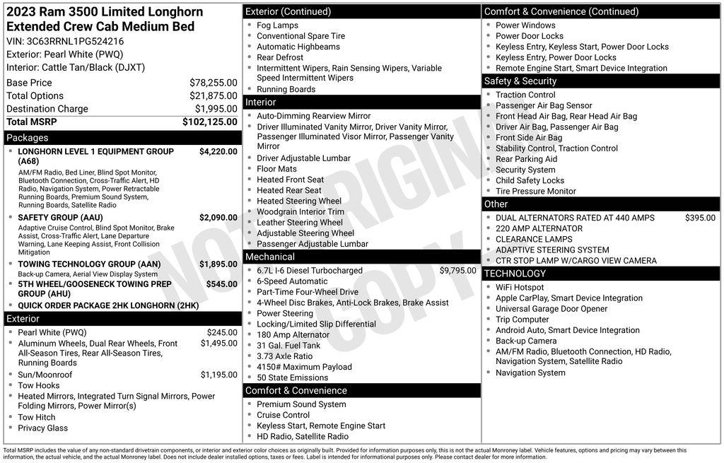 2023 Ram 3500 Laramie Longhorn Pearl White Laramie Longhorn 4WD 6-Speed Automatic Cummins 6.7L I6 Turbodiesel 10 Speakers, 115V Auxiliary Rear Power Outlet, 12" Touchscreen Display, 17 Speaker harman kardon Premium Sound, 2 Way Rear Headrest Seat, 220 Amp Alternator, 3.73 Axle Ratio, 4 Way Front Headrests, 4-Wheel Disc Brakes, 4G LTE Wi-Fi Hot Spot, 5th Wheel/Gooseneck Towing Prep Group, 6000# Front Axle w/Hub Ext, ABS brakes, Active Noise Control System, Adaptive Cruise Control w/Stop, Adaptive Steering System, Adjustable pedals, Air Conditioning, Alexa Built-In, Alloy wheels, AM/FM radio: SiriusXM with 360L, Apple CarPlay, Apple CarPlay/Android Auto, Audio memory, Auto High-beam Headlights, Auto-dimming door mirrors, Auto-dimming Rear-View mirror, Automatic temperature control, Blind Spot & Cross Path Detection, Box & Rear Fender Clearance Lamps, Brake assist, Bucket Seats, Bumpers: body-color, Center Hub, Chrome Flat Cab-Length Side Steps, Clearance Lamps, Compass, Connected Travel & Traffic Services, Connectivity - US/Canada, CTR Stop Lamp w/Cargo View Camera, Delay-off headlights, Disassociated Touchscreen Display, Driver door bin, Driver vanity mirror, Dual front impact airbags, Dual front side impact airbags, Dual Rear Wheel Fender Flare Tracking, Dual Rear Wheels, Electronic Stability Control, Electronically Controlled Throttle, For Details Visit DriveUconnect.com, For More Info, Call 800-643-2112, Front anti-roll bar, Front Bucket Seats, Front Center Armrest w/Storage, Front dual zone A/C, Front fog lights, Front reading lights, Front Seat Back Map Pockets, Full Length Premium Upgraded Floor Console, Full Speed Forward Collision Warning Plus, Fully automatic headlights, Garage door transmitter, Genuine wood console insert, Genuine wood dashboard insert, Genuine wood door panel insert, Global Telematics Box Module (TBM), Google Android Auto, GPS Antenna Input, GPS Navigation, HD Radio, Heated door mirrors, Heated Front Seats, Heated front seats, Heated rear seats, Heated Second Row Seats, Heated Steering Wheel, Heated steering wheel, High Back Seats, Illuminated entry, Integrated Voice Command w/Bluetooth, Lane Keep Assist, Leather steering wheel, LED Bed Lighting, Longhorn Level 1 Equipment Group, Low tire pressure warning, Memory seat, MOPAR Spray In Bedliner, Navigation System, Occupant sensing airbag, Off-Road Information Pages, Outside temperature display, Overhead airbag, Overhead console, Panic alarm, ParkView Rear Back-Up Camera, Passenger door bin, Passenger vanity mirror, Pedal memory, Power 8-Way Adjustable Passenger Seat, Power Adjust 8-Way Driver Seat, Power Deployable Running Boards, Power door mirrors, Power driver seat, Power passenger seat, Power steering, Power Sunroof, Power windows, Premium Filigree Leather Seats, Quick Order Package 2HK Longhorn, Radio data system, Radio: Uconnect 5 Nav w/12.0" Display, Radio: Uconnect 5 Nav w/8.4" Display, Radio/Driver Seat/Mirrors/Pedals Memory, Rain sensing wipers, Ramcharger Wireless Charging Pad, Rear 60/40 Folding Seat, Rear reading lights, Rear seat center armrest, Rear step bumper, Rear window defroster, Remote keyless entry, Safety Group, Security system, Selectable Tire Fill Alert, SiriusXM Radio Service, SiriusXM w/360L, Speed control, Split folding rear seat, Steering wheel mounted audio controls, Surround View Camera System, Tachometer, Tilt steering wheel, Tip Start, Towing Technology Group, Traction control, Trailer Reverse Guidance, Trailer Tow Pages, Trip computer, Turn signal indicator mirrors, Variably intermittent wipers, Vendor Painted Cargo Box, Vendor Painted Cargo Box Tracking, Ventilated Front Seats, Ventilated front seats, Voltmeter, Wheels: 17" x 6.0" Polished Aluminum, Wheels: 18" x 8.0" Diamond Cut Face Aluminum.