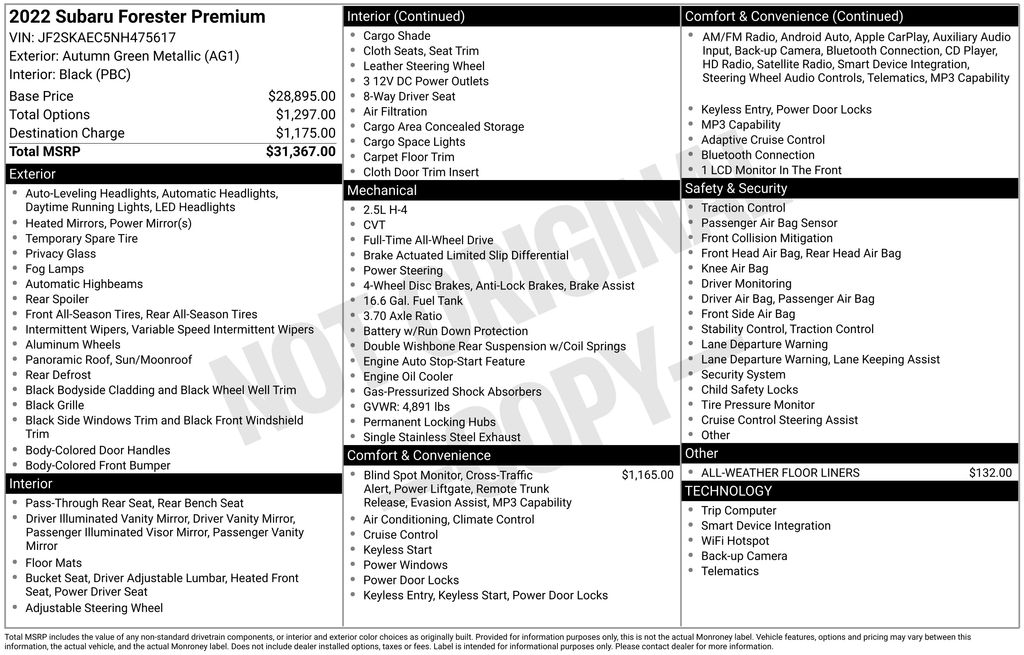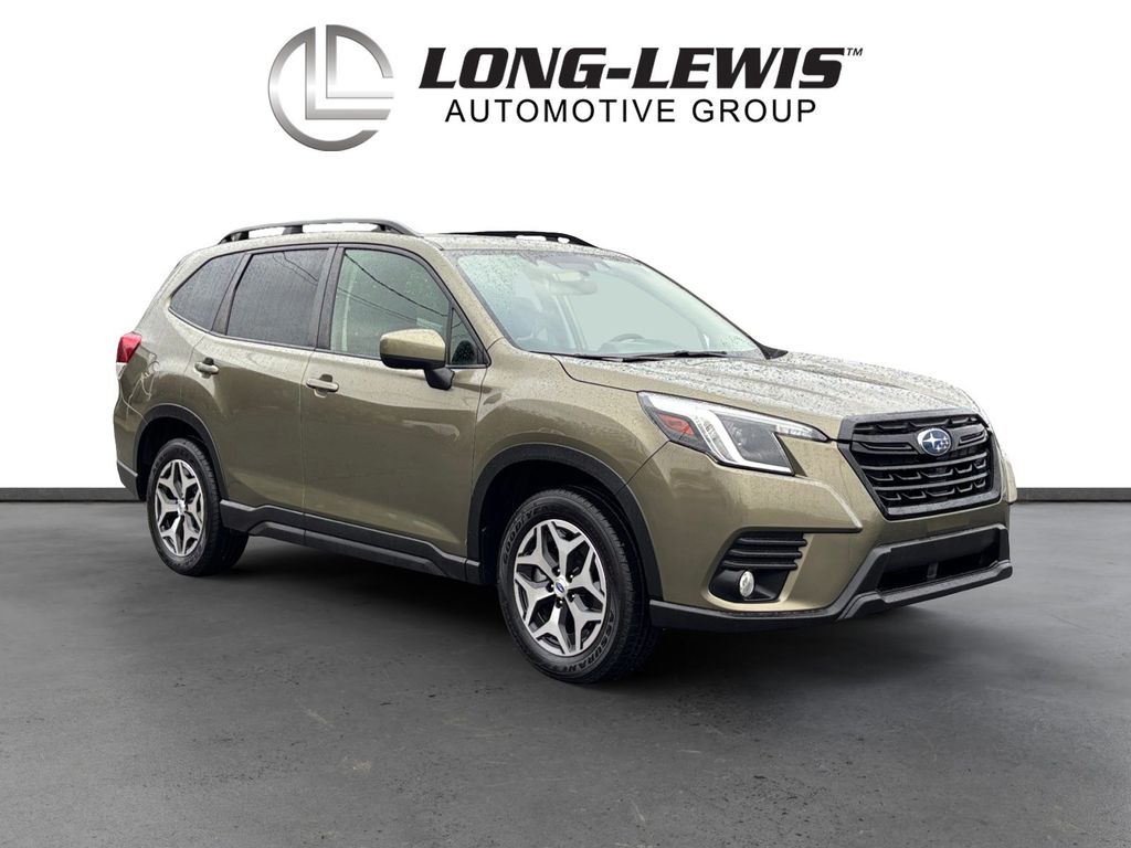 2022 Subaru Forester Premium Autumn Green Metallic Premium AWD Lineartronic CVT 2.5L 4-Cylinder DOHC 16V 3.70 Axle Ratio, 4-Wheel Disc Brakes, 6 Speakers, ABS brakes, Air Conditioning, All-Weather Floor Liners, Alloy wheels, AM/FM radio: SiriusXM, Anti-whiplash front head restraints, Auto High-beam Headlights, Automatic temperature control, Blind Spot Detection (BSD), Blind Spot Detection w/RCTA & Power Rear Gate, Brake assist, Bumpers: body-color, CD player, Driver door bin, Driver vanity mirror, Driver's Seatback Divided Pocket, Dual front impact airbags, Dual front side impact airbags, Dual USB Charge Ports, Electronic Stability Control, Emergency communication system: STARLINK Safety and Security (Subscription Required), Exterior Parking Camera Rear, EyeSight System, Four wheel independent suspension, Front anti-roll bar, Front Bucket Seats, Front Center Armrest, Front fog lights, Front reading lights, Fully automatic headlights, Heated door mirrors, Heated Front Bucket Seats, Heated front seats, Illuminated entry, Knee airbag, Low tire pressure warning, Multi-Function High Grade Display, Occupant sensing airbag, Outside temperature display, Overhead airbag, Overhead console, Panic alarm, Passenger door bin, Passenger vanity mirror, Power door mirrors, Power driver seat, Power moonroof: Panoramic, Power Rear Gate, Power steering, Power windows, Premium Cloth Upholstery, Radio data system, Radio: Subaru Starlink 6.5" Multimedia Plus System, Rear anti-roll bar, Rear seat center armrest, Rear window defroster, Rear window wiper, Remote keyless entry, Roof rack: rails only, Security system, Speed control, Speed-sensing steering, Split folding rear seat, Spoiler, STARLINK/Apple CarPlay/Android Auto, Steering wheel mounted audio controls, Tachometer, Telescoping steering wheel, Tilt steering wheel, Traction control, Trip computer, Variably intermittent wipers, Wheels: 17" x 7.0J Black Machine Finish Alloy.