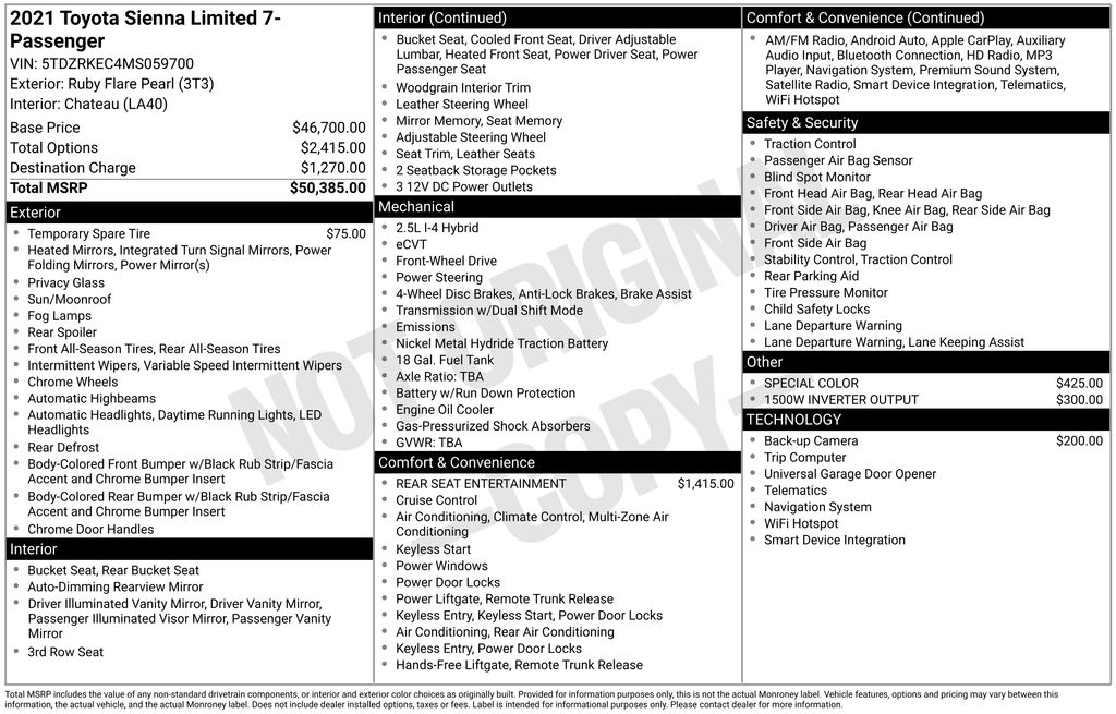 2021 Toyota Sienna 7 Passenger Red 7 Passenger FWD CVT 2.5L I4 12 Speakers, 3rd row seats: split-bench, 4-Wheel Disc Brakes, ABS brakes, Air Conditioning, Alloy wheels, AM/FM radio: SiriusXM, Apple CarPlay/Android Auto, Auto High-beam Headlights, Auto-dimming door mirrors, Auto-dimming Rear-View mirror, Automatic temperature control, Axle Ratio: TBA, Brake assist, Bumpers: body-color, Compass, Delay-off headlights, Door auto-latch, Driver door bin, Driver vanity mirror, Driver's Seat Mounted Armrest, Dual front impact airbags, Dual front side impact airbags, Electronic Stability Control, Emergency communication system: Safety Connect with 3-year trial, Four wheel independent suspension, Front anti-roll bar, Front Bucket Seats, Front dual zone A/C, Front fog lights, Front Heated & Ventilated Bucket Seats, Front reading lights, Fully automatic headlights, Garage door transmitter: HomeLink, Heated door mirrors, Heated front seats, Illuminated entry, Knee airbag, Lane Departure Warning System, Leather Seat Material, Leather Shift Knob, Leather steering wheel, Low tire pressure warning, Memory seat, Navigation System, Occupant sensing airbag, Outside temperature display, Overhead airbag, Overhead console, Panic alarm, Passenger door bin, Passenger seat mounted armrest, Passenger vanity mirror, Power door mirrors, Power driver seat, Power Liftgate, Power moonroof, Power passenger seat, Power steering, Power windows, Radio data system, Radio: Premium JBL Audio, Rear air conditioning, Rear anti-roll bar, Rear dual zone A/C, Rear reading lights, Rear side impact airbag, Rear window defroster, Rear window wiper, Reclining 3rd row seat, Remote keyless entry, Roof rack: rails only, Speed control, Speed-sensing steering, Split folding rear seat, Spoiler, Steering wheel memory, Steering wheel mounted audio controls, Tachometer, Telescoping steering wheel, Tilt steering wheel, Traction control, Trip computer, Turn signal indicator mirrors, Variably intermittent wipers, Ventilated front seats.