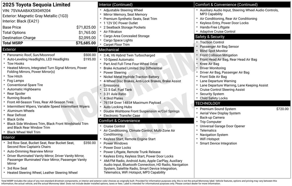 2025 Toyota Sequoia Limited Gray Limited 4WD 10-Speed Automatic V6 Hybrid V6 Hybrid, 10-Speed Automatic, 4WD, 3rd row seats: split-bench, 4-Wheel Disc Brakes, 8 Speakers, ABS brakes, Air Conditioning, Alloy wheels, AM/FM radio: SiriusXM, Anti-whiplash front head restraints, Apple CarPlay/Android Auto, Auto High-beam Headlights, Auto-dimming door mirrors, Auto-dimming Rear-View mirror, Automatic temperature control, Brake assist, Bumpers: body-color, Delay-off headlights, Driver door bin, Driver vanity mirror, Dual front impact airbags, Dual front side impact airbags, Electronic Stability Control, Emergency communication system: Safety Connect (10-year trial), Exterior Parking Camera Rear, Front anti-roll bar, Front Bucket Seats, Front Center Armrest w/Storage, Front dual zone A/C, Front fog lights, Front reading lights, Front wheel independent suspension, Fully automatic headlights, Garage door transmitter: HomeLink, Headlight cleaning, Heated & Ventilated Front Seats, Heated door mirrors, Heated front seats, Heated steering wheel, Illuminated entry, Knee airbag, Leather Shift Knob, Leather steering wheel, Low tire pressure warning, Memory seat, Navigation system: Drive Connect (1 year trial) includes Cloud Navigation with real time traffic and Google POI, Occupant sensing airbag, Outside temperature display, Overhead airbag, Overhead console, Panic alarm, Passenger door bin, Passenger vanity mirror, Power door mirrors, Power driver seat, Power Liftgate, Power moonroof, Power passenger seat, Power steering, Power windows, Radio: 14" Toyota Audio Multimedia, Rear air conditioning, Rear reading lights, Rear seat center armrest, Rear window defroster, Rear window wiper, Reclining 3rd row seat, Remote keyless entry, Security system, SofTex Seat Trim, Speed control, Speed-sensing steering, Split folding rear seat, Spoiler, Steering wheel mounted audio controls, Tachometer, Telescoping steering wheel, Tilt steering wheel, Traction control, Trip computer, Turn signal indicator mirrors, Variably intermittent wipers, Ventilated front seats, Voltmeter, Wheels: 20" Machined-Finish Alloy, V6 Hybrid, 10-Speed Automatic, 4WD.