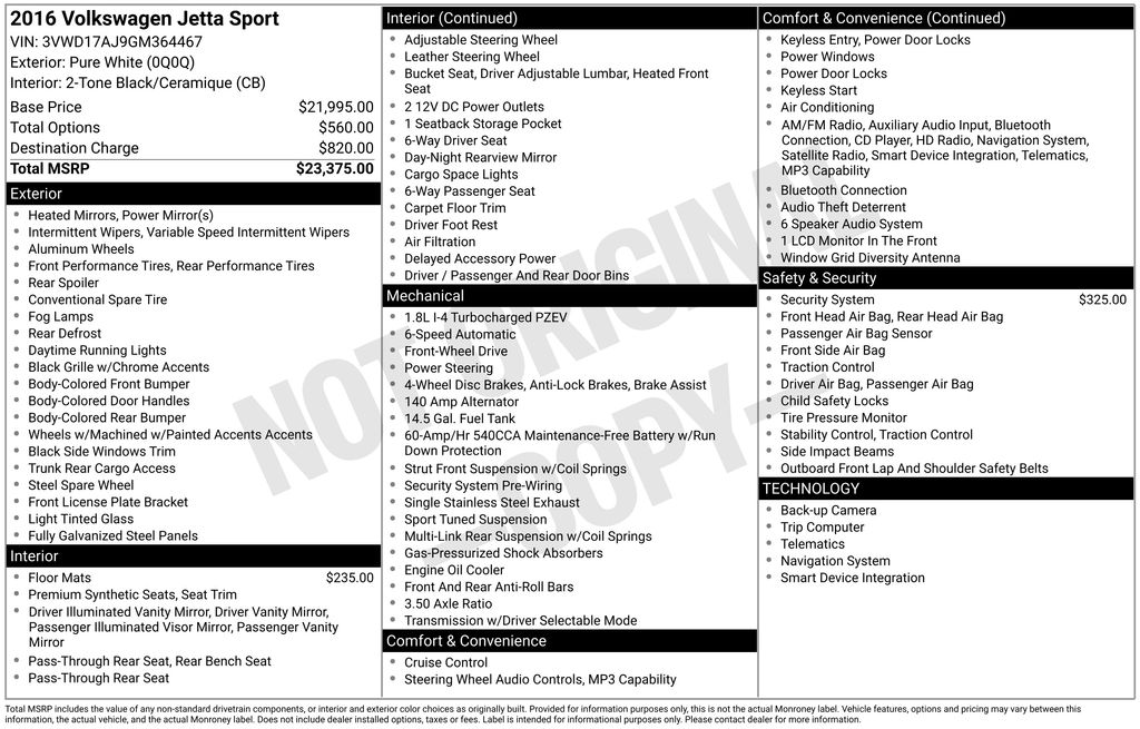 2016 Volkswagen Jetta 1.8T Sport Pure White 1.8T Sport FWD 6-Speed Automatic with Tiptronic 1.8L I4 Turbocharged 2-Tone Black/Ceramique Premium Synthetic, 4-Wheel Disc Brakes, 6 Speaker Audio System, 6 Speakers, ABS brakes, Air Conditioning, Alarm Kit, Alloy wheels, AM/FM radio: SiriusXM, Brake assist, Bumpers: body-color, CD player, Driver door bin, Driver vanity mirror, Dual front impact airbags, Dual front side impact airbags, Electronic Stability Control, Emergency communication system: VW Car-Net, Exterior Parking Camera Rear, Four wheel independent suspension, Front anti-roll bar, Front Bucket Seats, Front Center Armrest, Front fog lights, Heated door mirrors, Heated Front Comfort Sport Seats, Heated front seats, Heavy Duty Trunk Liner w/CarGo Blocks, Illuminated entry, Leather Shift Knob, Leather steering wheel, Low tire pressure warning, Navigation System, Occupant sensing airbag, Outside temperature display, Overhead airbag, Overhead console, Panic alarm, Passenger door bin, Passenger vanity mirror, Power door mirrors, Power steering, Power windows, Radio data system, Radio: Discover Media w/Navigation, Rear anti-roll bar, Rear reading lights, Rear seat center armrest, Rear window defroster, Remote keyless entry, Rubber Mat Kit, Speed control, Speed-sensing steering, Split folding rear seat, Spoiler, Steering wheel mounted audio controls, Tachometer, Telescoping steering wheel, Tilt steering wheel, Traction control, Trip computer, V-Tex Leatherette Seat Trim, Variably intermittent wipers, Wheels: 17" Joda Black Alloy, 2-Tone Black/Ceramique Premium Synthetic.