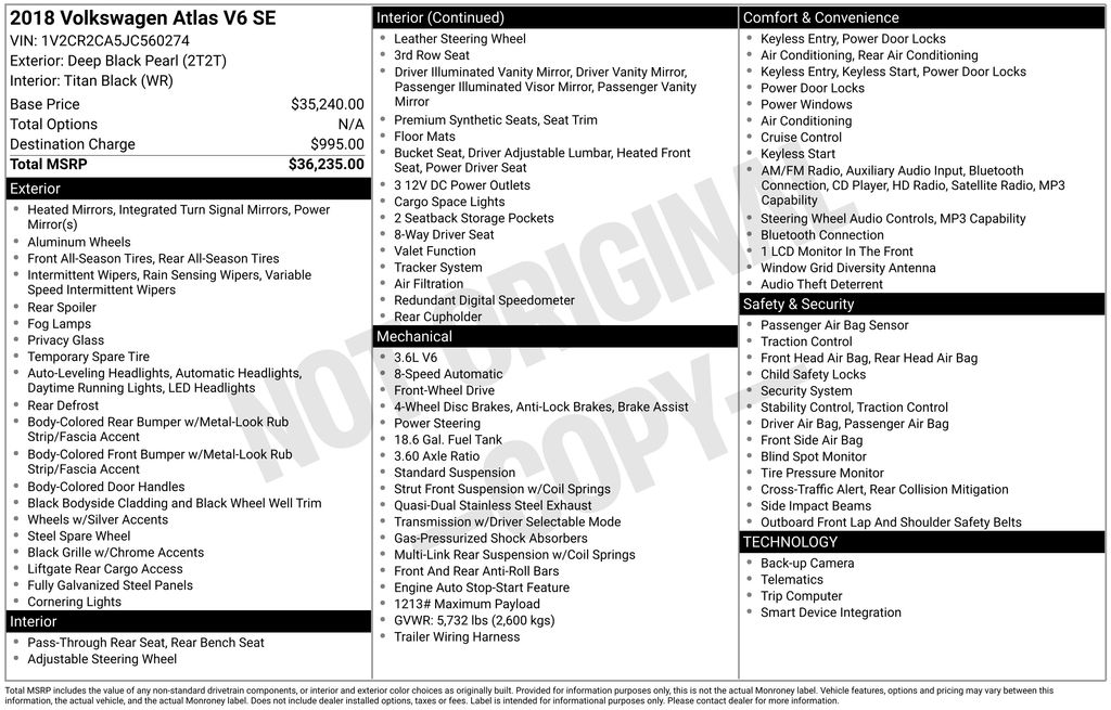 2018 Volkswagen Atlas 3.6L V6 SE Deep Black 3.6L V6 SE FWD 8-Speed Automatic with Tiptronic 3.6L VR6 3.60 Axle Ratio, 3rd row seats: split-bench, 4-Wheel Disc Brakes, 8 Speakers, ABS brakes, Air Conditioning, Alloy wheels, AM/FM radio: SiriusXM, Brake assist, Bumpers: body-color, Compass, Delay-off headlights, Driver door bin, Driver vanity mirror, Dual front impact airbags, Dual front side impact airbags, Electronic Stability Control, Emergency communication system: VW Car-Net, Exterior Parking Camera Rear, Four wheel independent suspension, Front anti-roll bar, Front Bucket Seats, Front Center Armrest, Front fog lights, Front reading lights, Heated door mirrors, Heated Front Bucket Seats, Heated front seats, Illuminated entry, Low tire pressure warning, Occupant sensing airbag, Outside temperature display, Overhead airbag, Overhead console, Panic alarm, Passenger door bin, Passenger vanity mirror, Power door mirrors, Power driver seat, Power steering, Power windows, Radio data system, Radio: Composition Media 8.0" Touchscreen w/CD, Rain sensing wipers, Rear air conditioning, Rear anti-roll bar, Rear reading lights, Rear seat center armrest, Rear window defroster, Rear window wiper, Remote CD player, Remote keyless entry, Roof rack: rails only, Security system, Speed control, Speed-sensing steering, Split folding rear seat, Spoiler, Standard Suspension, Steering wheel mounted audio controls, Tachometer, Telescoping steering wheel, Tilt steering wheel, Traction control, Trip computer, Turn signal indicator mirrors, V-Tex Leatherette Seating Surfaces, Variably intermittent wipers, Wheels: 18" Prisma Alloy.