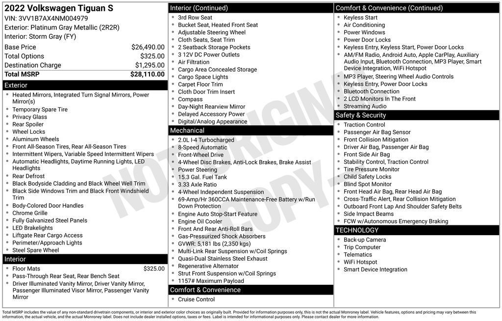 2022 Volkswagen Tiguan 2.0T S Certified. Platinum Gray Metallic 2.0T S FWD 8-Speed Automatic with Tiptronic 2.0L TSI DOHC Volkswagen Certified, 3-Row Rubber Monster Mats w/Logo Kit (Set of 5), 3.33 Axle Ratio, 3rd row seats: bench, 4-Wheel Disc Brakes, 4-Wheel Independent Suspension, 6 Speakers, ABS brakes, Air Conditioning, Alloy wheels, AM/FM radio, Brake assist, Bumpers: body-color, Cloth Seating Surfaces, Compass, Delay-off headlights, Driver door bin, Driver vanity mirror, Dual front impact airbags, Dual front side impact airbags, Electronic Stability Control, Emergency communication system: Car-Net, Exterior Parking Camera Rear, Forward collision: FCW w/Autonomous Emergency Braking mitigation, Four wheel independent suspension, Front anti-roll bar, Front Bucket Seats, Front Center Armrest, Front reading lights, Fully automatic headlights, Heated door mirrors, Heated Front Bucket Seats, Heated front seats, Heavy Duty Trunk Liner w/VW CarGo Blocks, Illuminated entry, Leather Shift Knob, Low tire pressure warning, Occupant sensing airbag, Outside temperature display, Overhead airbag, Overhead console, Panic alarm, Passenger door bin, Passenger vanity mirror, Power door mirrors, Power steering, Power windows, Radio data system, Radio: Composition Color AM/FM, Rear anti-roll bar, Rear reading lights, Rear seat center armrest, Rear window defroster, Rear window wiper, Remote keyless entry, Roof rack: rails only, Speed control, Speed-sensing steering, Split folding rear seat, Spoiler, Steering wheel mounted audio controls, Tachometer, Telescoping steering wheel, Tilt steering wheel, Traction control, Trip computer, Turn signal indicator mirrors, Variably intermittent wipers, Wheels: 17" 2-Tone Machined Twin 5-Spoke Alloy.