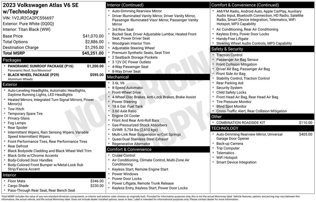 2023 Volkswagen Atlas 3.6L V6 SE w/Technology Pure White 3.6L V6 SE w/Technology FWD 8-Speed Automatic with Tiptronic 3.6L VR6 3.60 Axle Ratio, 3rd row seats: split-bench, 4-Wheel Disc Brakes, 6 Speakers, ABS brakes, Air Conditioning, Alloy wheels, AM/FM radio: SiriusXM with 360L, Auto-Dimming Rear-View Mirror, Auto-dimming Rear-View mirror, Automatic temperature control, Black Wheel Package, Brake assist, Bumpers: body-color, Compass, Delay-off headlights, Driver door bin, Driver vanity mirror, Dual front impact airbags, Dual front side impact airbags, Electronic Stability Control, Emergency communication system: VW Car-Net Safe & Secure 5-year, Exterior Parking Camera Rear, First Aid Kit, Four wheel independent suspension, Front anti-roll bar, Front Bucket Seats, Front Center Armrest, Front dual zone A/C, Front fog lights, Front reading lights, Fully automatic headlights, Heated Comfort Front Bucket Seats, Heated door mirrors, Heated front seats, Heavy Duty Trunk Liner w/VW CarGo Blocks, Illuminated entry, Leather Shift Knob, Low tire pressure warning, Occupant sensing airbag, Outside temperature display, Overhead airbag, Overhead console, Panic alarm, Panoramic Sunroof Package, Passenger door bin, Passenger vanity mirror, Perforated V-Tex Leatherette Seating Surfaces, Power door mirrors, Power driver seat, Power Liftgate, Power steering, Power Tilting & Sliding Panoramic Sunroof, Power windows, Privacy Cover, Radio data system, Radio: MIB3 Composition Media w/8" Touchscreen, Rain sensing wipers, Rear air conditioning, Rear anti-roll bar, Rear reading lights, Rear seat center armrest, Rear window defroster, Rear window wiper, Remote keyless entry, Roadside Assistance Kit, Rubber Mats Kit - Bench Seats, Security system, Speed control, Speed-sensing steering, Split folding rear seat, Spoiler, Standard Suspension, Steering wheel mounted audio controls, Tachometer, Telescoping steering wheel, Tilt steering wheel, Traction control, Trip computer, Turn signal indicator mirrors, Variably intermittent wipers, Wheels: 20" x 8J 5-Spoke Black Painted Alloy, Wheels: 20" x 8J 5-Spoke Silver Painted Alloy.