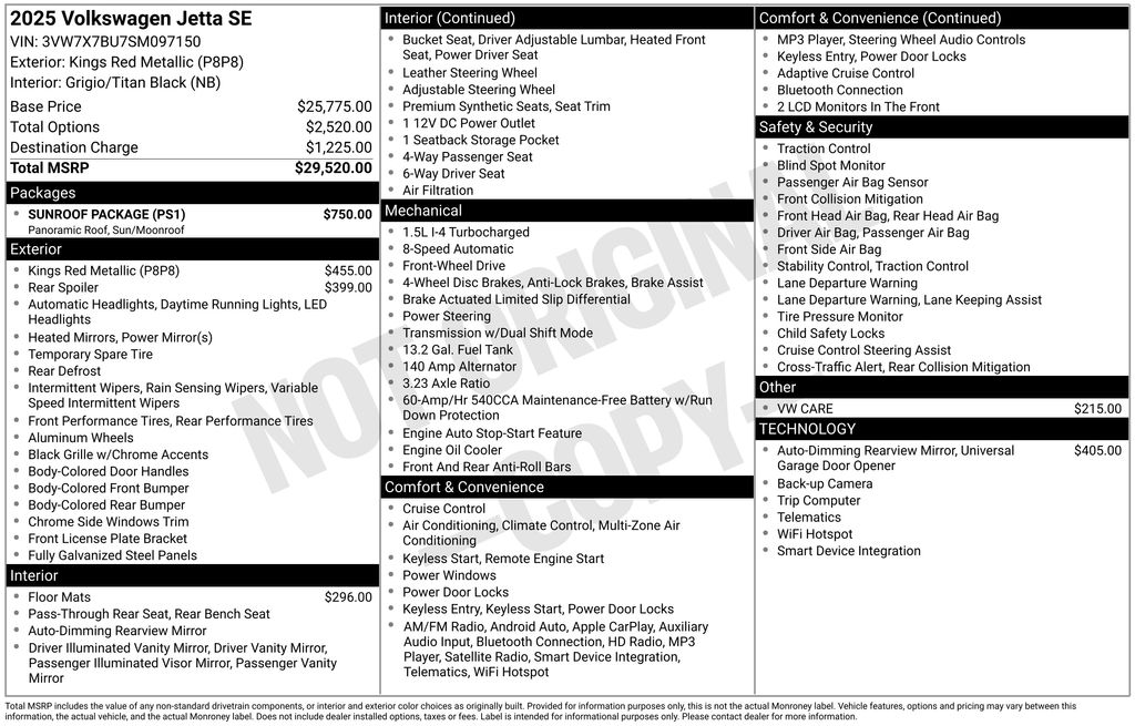 2025 Volkswagen Jetta 1.5T SE Kings Red Metallic 1.5T SE FWD 8-Speed Automatic with Tiptronic 1.5L I-4 DI DOHC Turbocharged Grigio/Titan Black Premium Synthetic, 4-Wheel Disc Brakes, 6 Speakers, ABS brakes, Active Blind Spot Monitor, Air Conditioning, Alloy wheels, AM/FM radio: SiriusXM with 360L, Auto-dimming Rear-View mirror, Auto-Dimming Rearview Mirror w/HomeLink Connect, Automatic temperature control, Black Trunk Lid Lip Spoiler, Brake assist, Bumpers: body-color, CloudTex & V-Tex Leatherette Seat Trim, Delay-off headlights, Driver door bin, Driver vanity mirror, Dual front impact airbags, Dual front side impact airbags, Electronic Stability Control, Emergency communication system: VW Car-Net Safe & Secure 5-year, Exterior Parking Camera Rear, Front anti-roll bar, Front Bucket Seats, Front Center Armrest, Front dual zone A/C, Front wheel independent suspension, Fully automatic headlights, Heated door mirrors, Heated Front Seats, Heated front seats, Heavy Duty Trunk Liner w/VW CarGo Blocks, Illuminated entry, Leather Shift Knob, Leather steering wheel, Low tire pressure warning, Occupant sensing airbag, Outside temperature display, Overhead airbag, Overhead console, Panic alarm, Passenger door bin, Passenger vanity mirror, Power door mirrors, Power driver seat, Power steering, Power Tilting & Sliding Sunroof, Power windows, Radio data system, Radio: MIB3 Composition Media w/8" Touchscreen, Rain sensing wipers, Rear anti-roll bar, Rear reading lights, Rear seat center armrest, Rear window defroster, Remote keyless entry, Rubber Monster Mats Kit (Set of 4), Speed control, Speed-sensing steering, Split folding rear seat, Steering wheel mounted audio controls, Sunroof Package, Tachometer, Telescoping steering wheel, Tilt steering wheel, Traction control, Trip computer, Variably intermittent wipers, VW Care, Wheels: 17" Twin 5-Spoke 2-Tone Machined Alloy, Grigio/Titan Black Premium Synthetic.