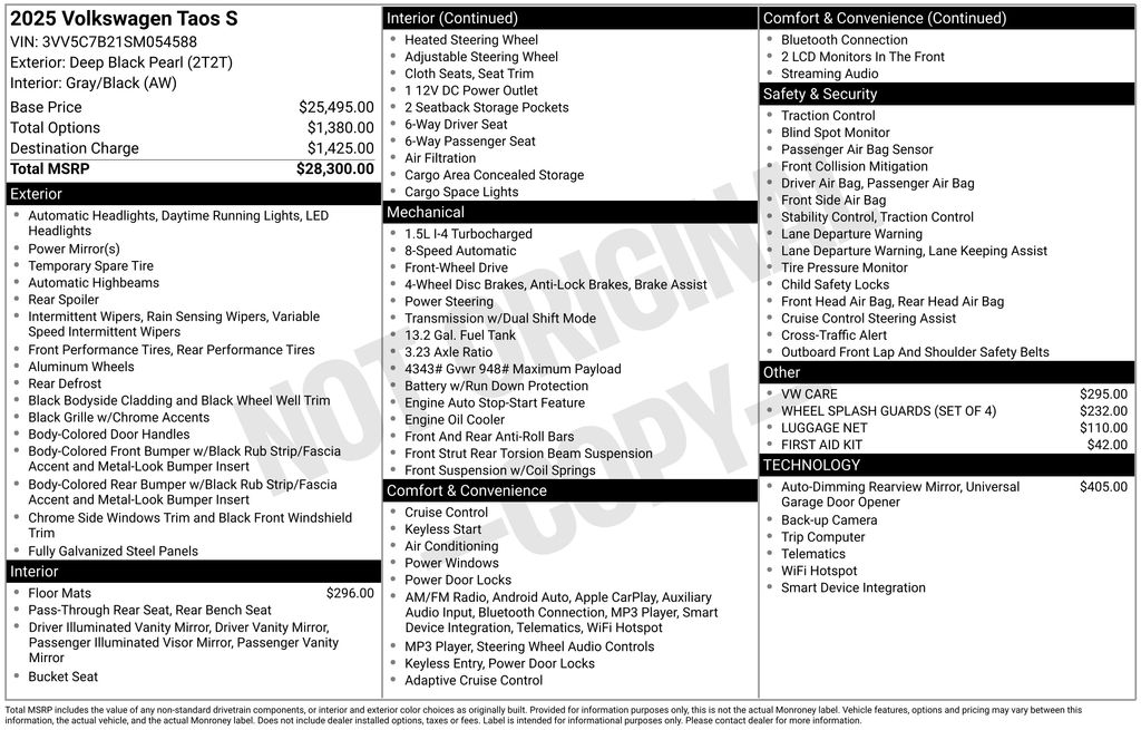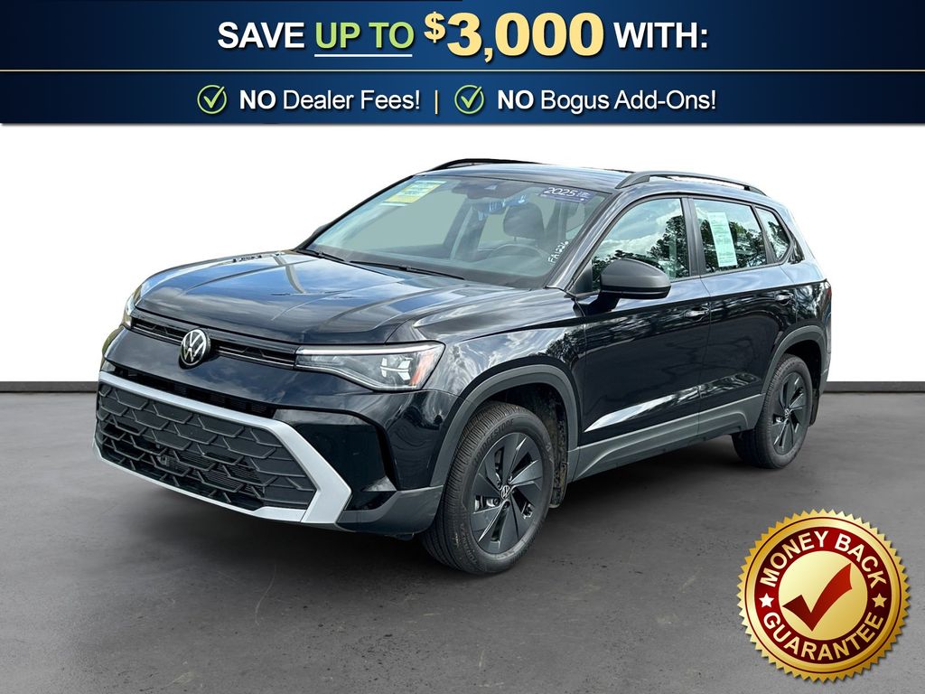 2025 Volkswagen Taos 1.5T S Deep Black Pearl 1.5T S FWD 8-Speed Automatic with Tiptronic 1.5L I4 Turbocharged DOHC 16V LEV3-SULEV30 174hp 4-Wheel Disc Brakes, 6 Speakers, ABS brakes, Active Blind Spot Monitor, Air Conditioning, Alloy wheels, AM/FM radio, Auto High-beam Headlights, Auto-Dimming Rearview Mirror with HomeLink Connect, Brake assist, Bumpers: body-color, Cloth Seating Surfaces, Compass, Delay-off headlights, Driver door bin, Driver vanity mirror, Dual front impact airbags, Dual front side impact airbags, Electronic Stability Control, Emergency communication system: VW Car-Net Safe & Secure 5-year, Exterior Parking Camera Rear, First Aid Kit, Front anti-roll bar, Front Bucket Seats, Front Center Armrest, Front reading lights, Front Strut Rear Torsion Beam Suspension, Front wheel independent suspension, Fully automatic headlights, Heated steering wheel, Illuminated entry, Leather Shift Knob, Low tire pressure warning, Luggage Net, Occupant sensing airbag, Outside temperature display, Overhead airbag, Overhead console, Panic alarm, Passenger door bin, Passenger vanity mirror, Power door mirrors, Power steering, Power windows, Radio data system, Radio: MIB3 Composition Color AM/FM, Rain sensing wipers, Rear anti-roll bar, Rear seat center armrest, Rear window defroster, Rear window wiper, Remote keyless entry, Rubber Mats Kit, Speed control, Speed-sensing steering, Split folding rear seat, Spoiler, Steering wheel mounted audio controls, Tachometer, Telescoping steering wheel, Tilt steering wheel, Traction control, Trip computer, Variably intermittent wipers, VW Care, Wheel Splash Guards (set of 4), Wheels: 17" Dark Silver Painted Alloy.